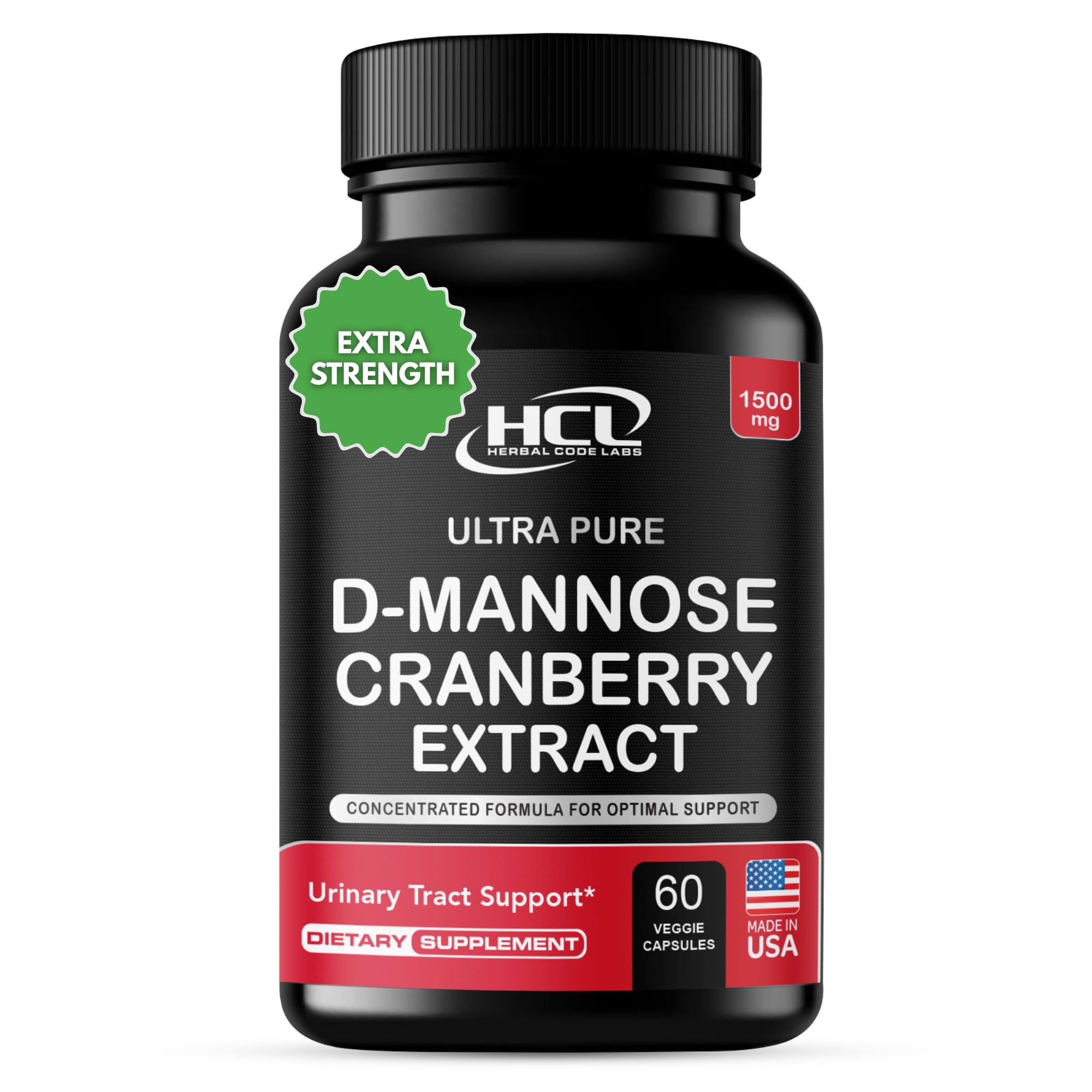 HCL HERBAL CODE LABS D-Mannose with Cranberry Extract Capsules 1500mg – High Potency USP Grade D-Mannose Supplement with Whole Fruit Cranberry Powder – Urinary Tract Support – Non-GMO 60 Capsules