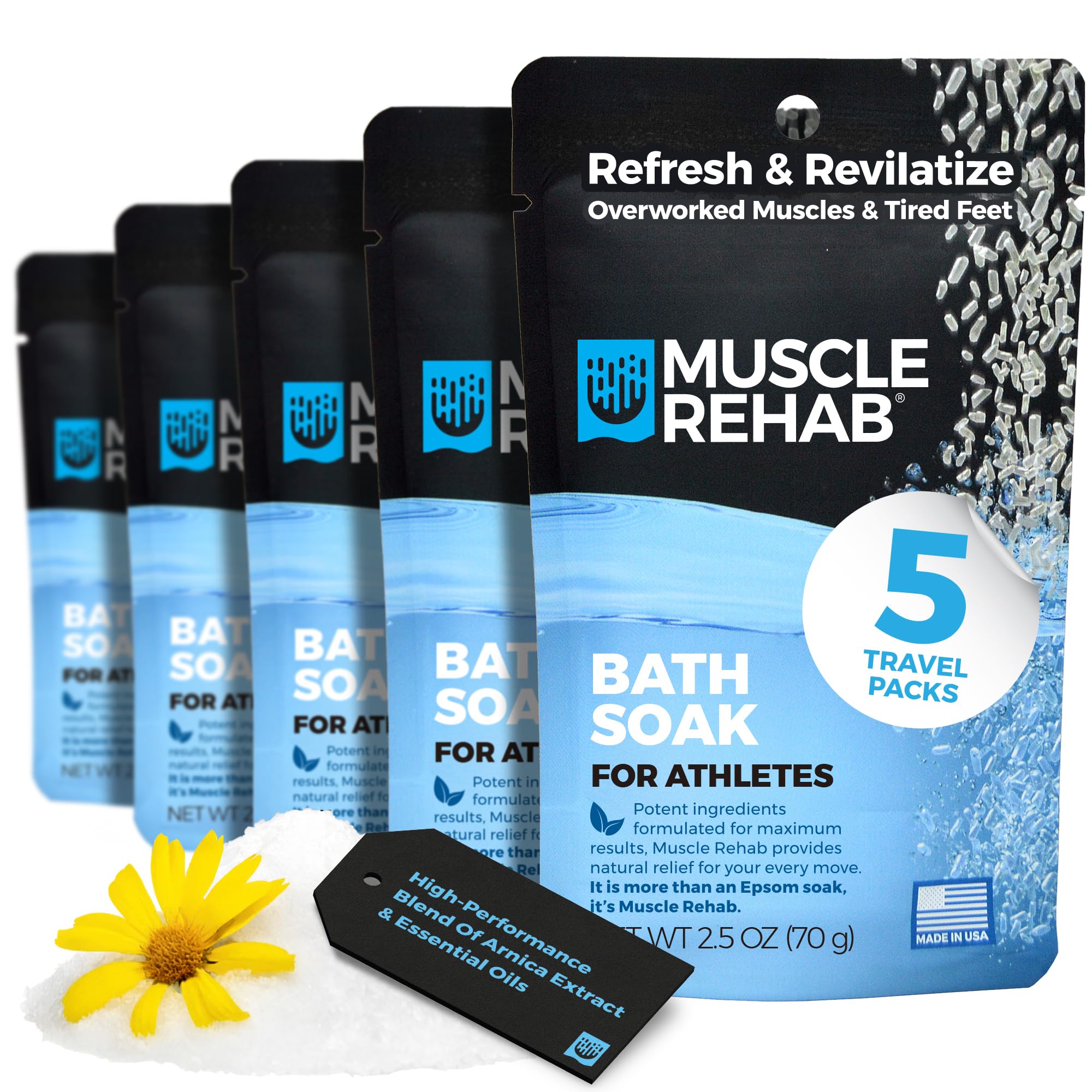 Muscle Rehab| (5) Travel Epsom Soak Packets Arnica, Magnesium Salt, Body, Hand, Foot Pain Relief, Sore Feet Relief, Foot Bath Soak, Epson Salts for Soaking Feet, Stiffness and Pain Relief, Single use