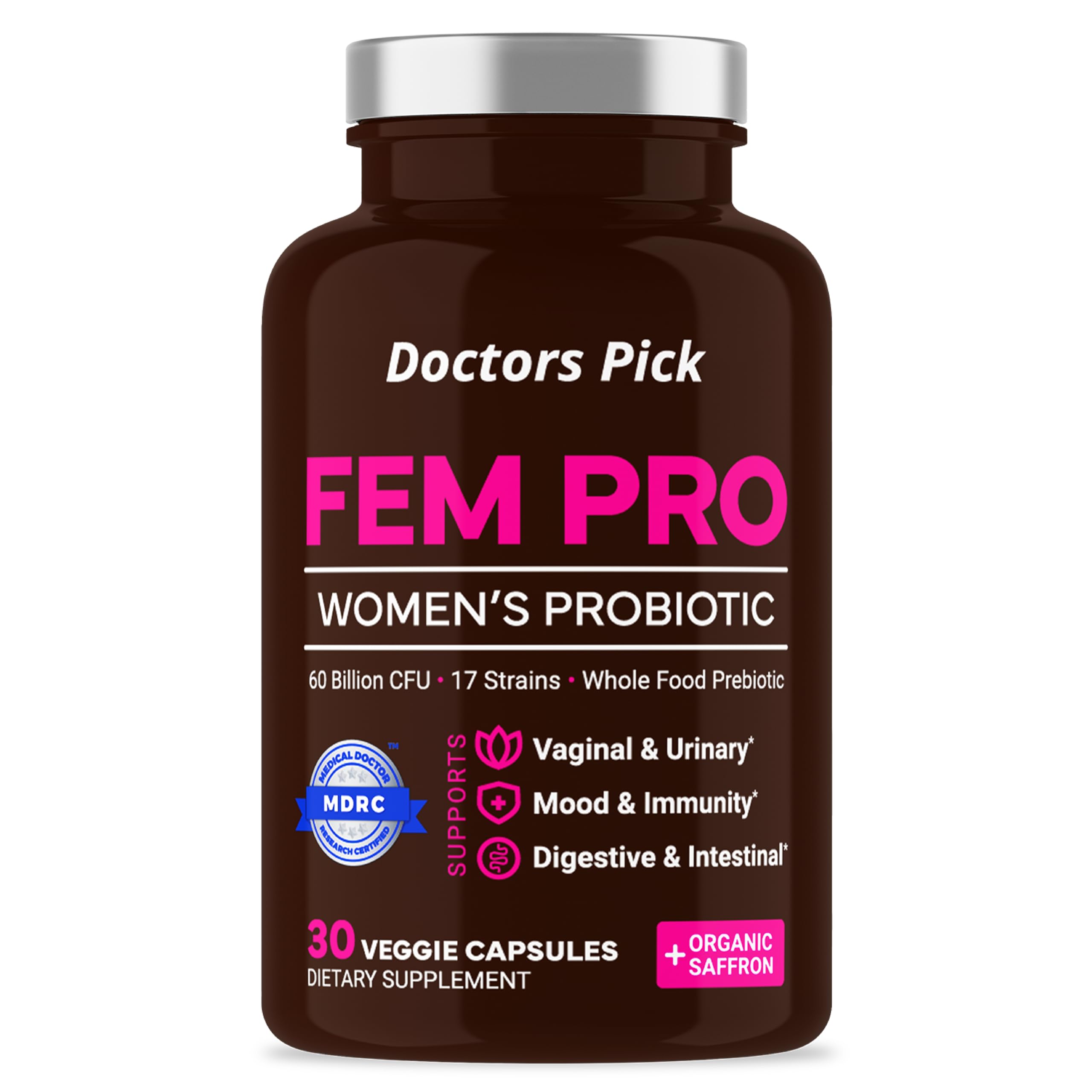 Doctors Pick Fem Pro Probiotics for Women. 17 Clinically Effective Strains for Vaginal, Digestive & Immune Support, Urinary Tract Health, pH Balance and Mood. Organic Prebiotic, 30 Veggie Capsules