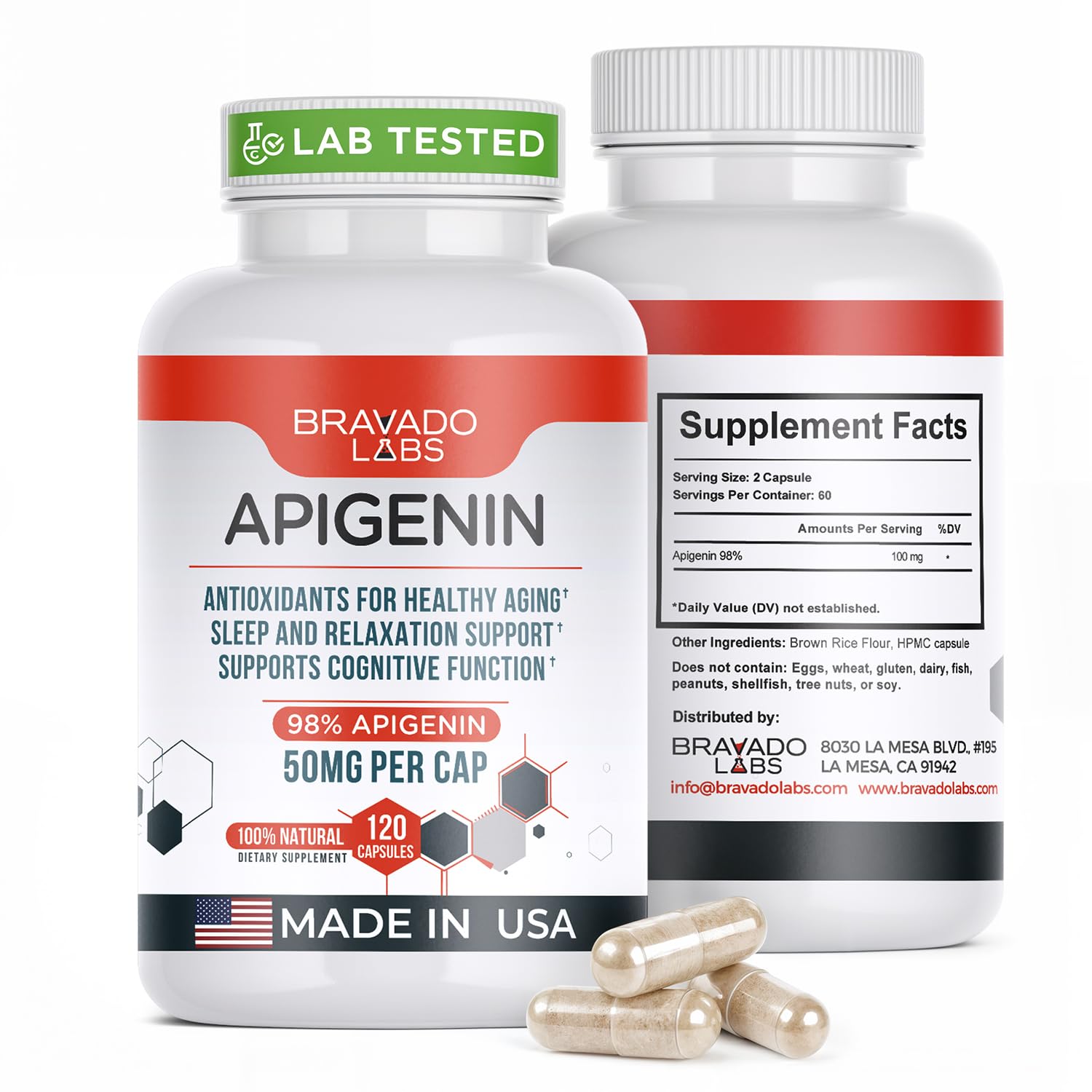 Bravado Labs Premium Apigenin Supplement - Pure, Concentrated Formula for Improved Sleep, Mood - Powerful Antioxidant Pills for Prostate and Healthy Aging Support - 120 ct