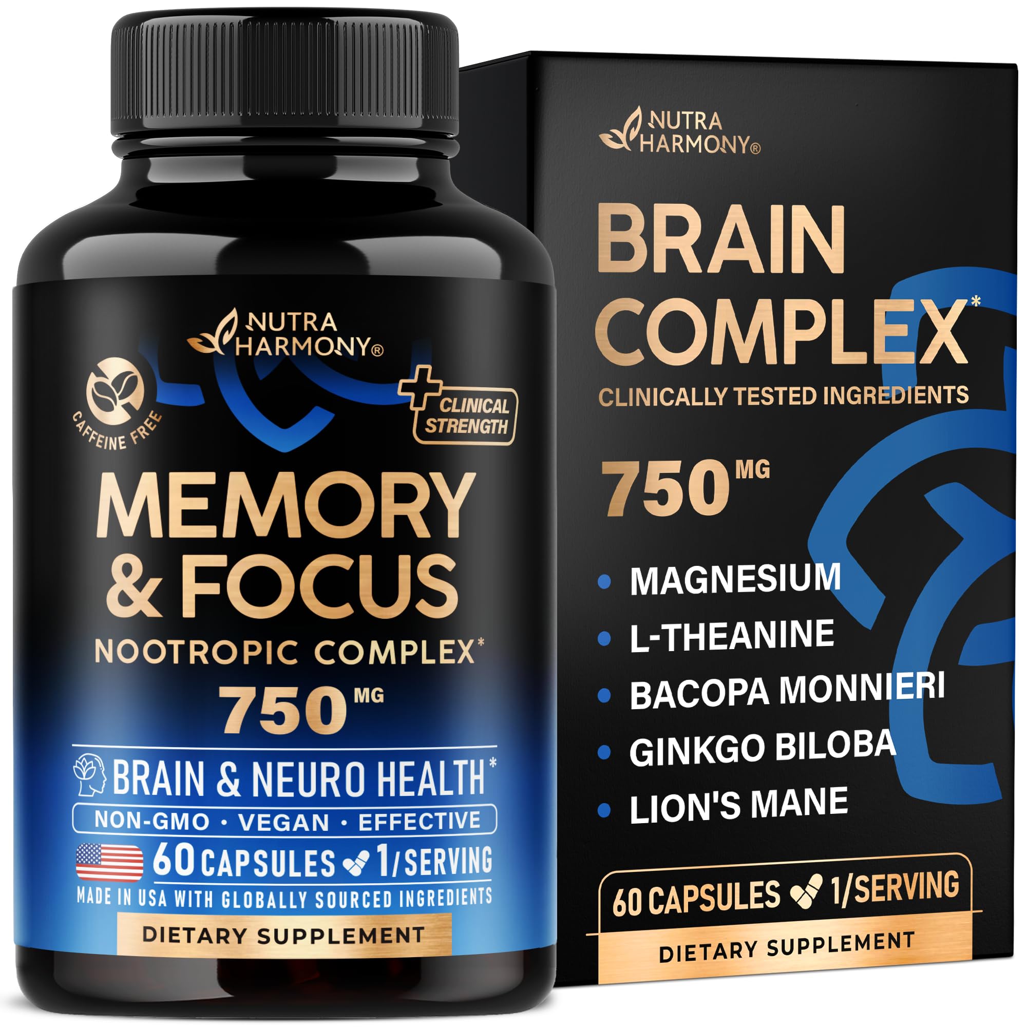 Brain Supplement for Memory & Focus 750 mg - Magnesium | L-Theanine | Bacopa Monnieri | Ginkgo Biloba | Lions Mane - 12in1 Nootropic Complex for Neuro Health - Caffeine-free - Made in USA, 60 Capsules