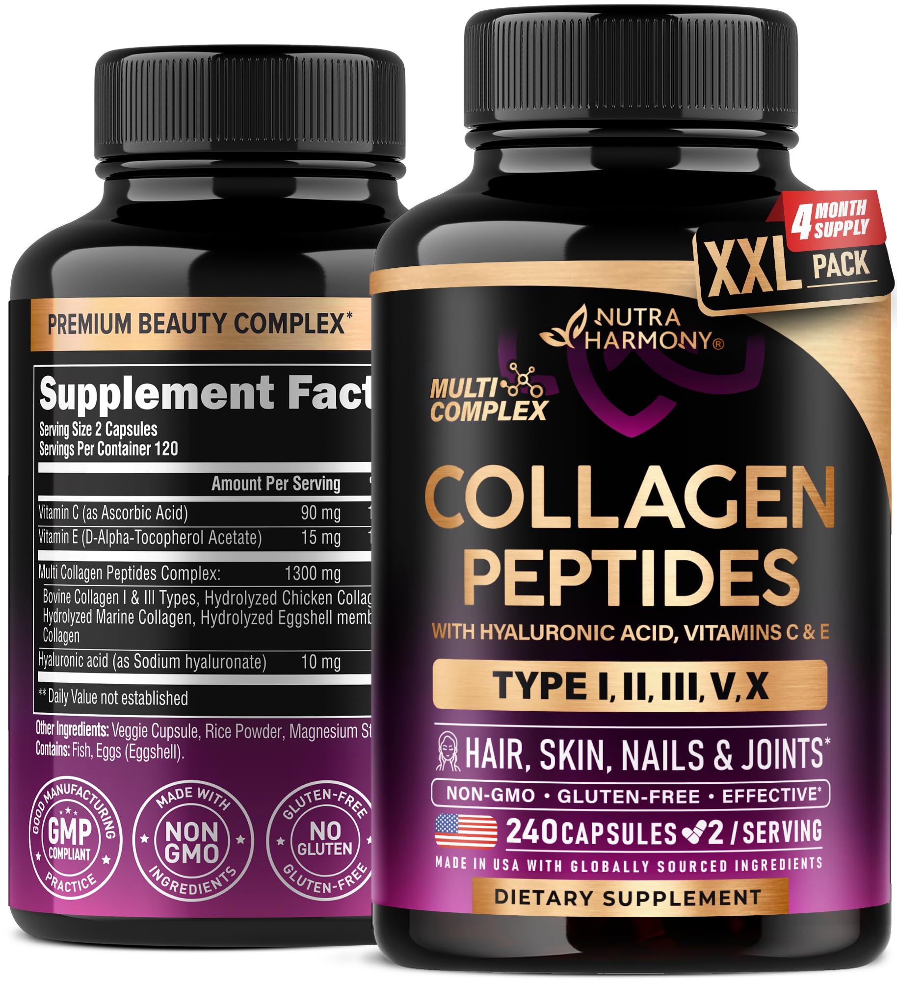 Multi Collagen Peptides - Hydrolyzed Types I, II, III, V & X - Collagen Supplement for Women 1300mg - w/ Hyaluronic Acid, Vitamins C & E - Skin, Hair, Nails & Joint Support - Made in USA, 240 Capsules