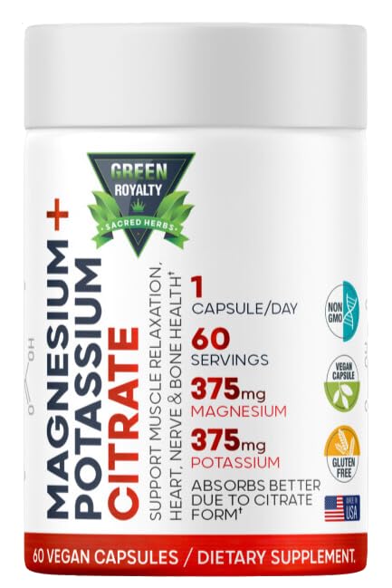 Magnesium Citrate + Potassium 60 Premium Vegan Capsules(Citrate 375 mg) + (375mg Potassium) Non GMO, Gluten Free - High Absorption Supplement Made in USA