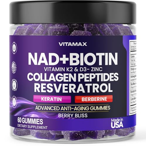 NAD+, Resveratrol, Berberine, & Biotin Anti-Aging Gummy - Hair, Skin, Nails & Joint Supplement - Collagen Peptides, Keratin, Zinc, Vitamin K2 & D3 Gummies -Regeneration- Non-GMO - Made in USA 60 Count