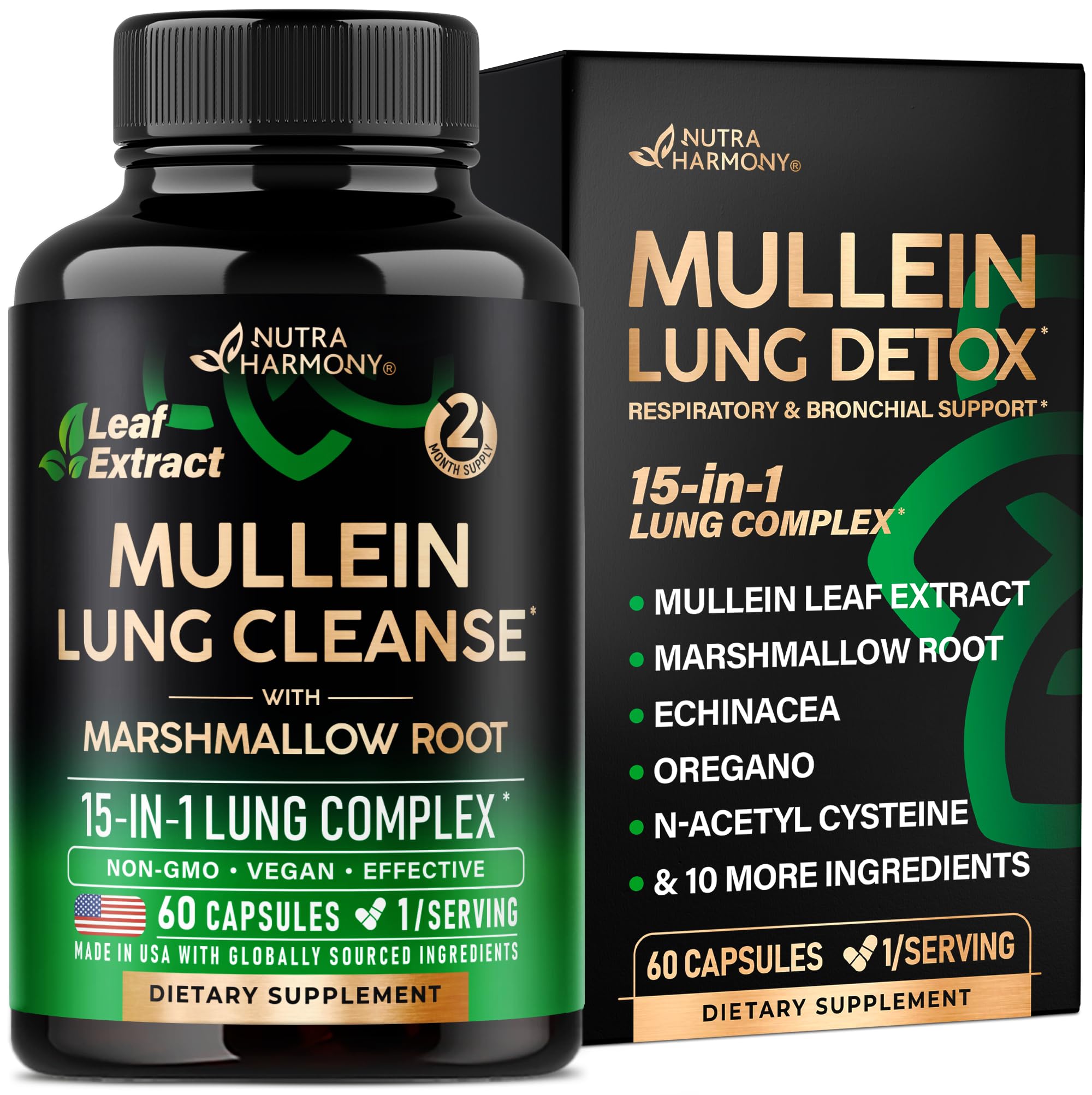 Mullein Leaf Extract for Lung Detox - Marshmallow Root | Echinacea | Oregano | Quercetin | NAC - 15-in-1 Lung Support & Cleanse for Smokers Supplement - Made in USA - As Drops, Tincture - 60 Capsules