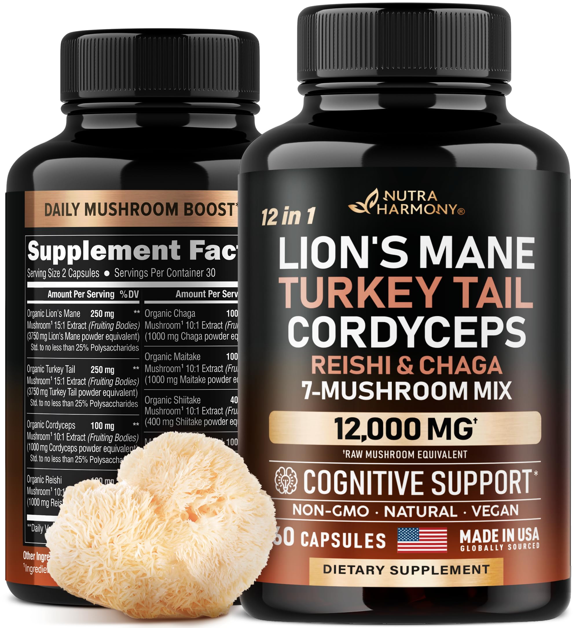 Brand: NUTRAHARMONYFeatures: Mushroom Complex – 12 premium mushrooms: organic Lions Mane, Turkey Tail, Cordyceps, Reishi, Chaga, Maitake, Shiitake, Meshima, Tremella,...