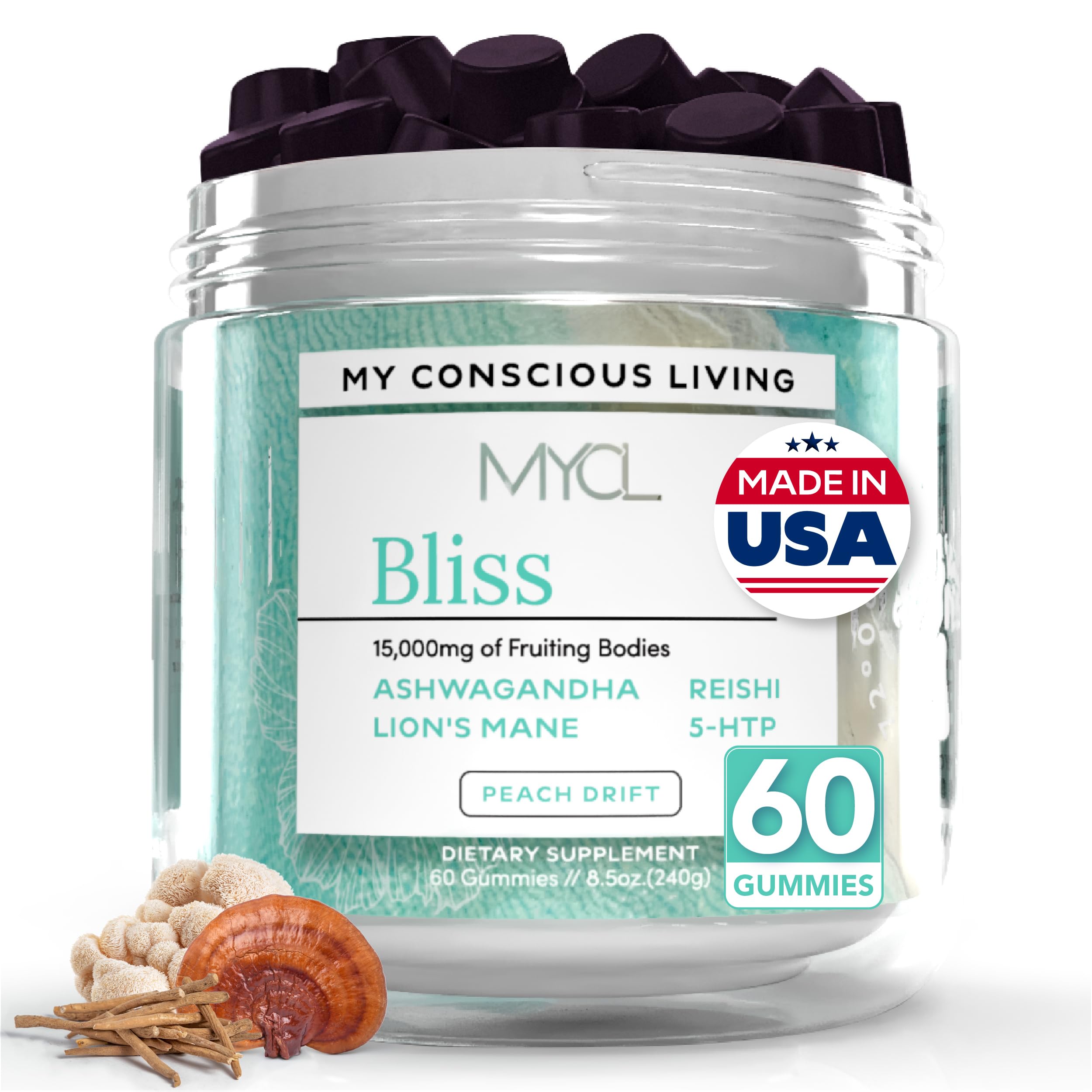 MYCL Bliss Mushroom Gummies | 500mg Ashwagandha, Reishi, Lion’s Mane, Lemon Balm & 5-HTP Whole Fruiting Body | Stress Relief, Relaxation & Mood Support | Vegan, Organic, Gluten-Free | 30 Servings