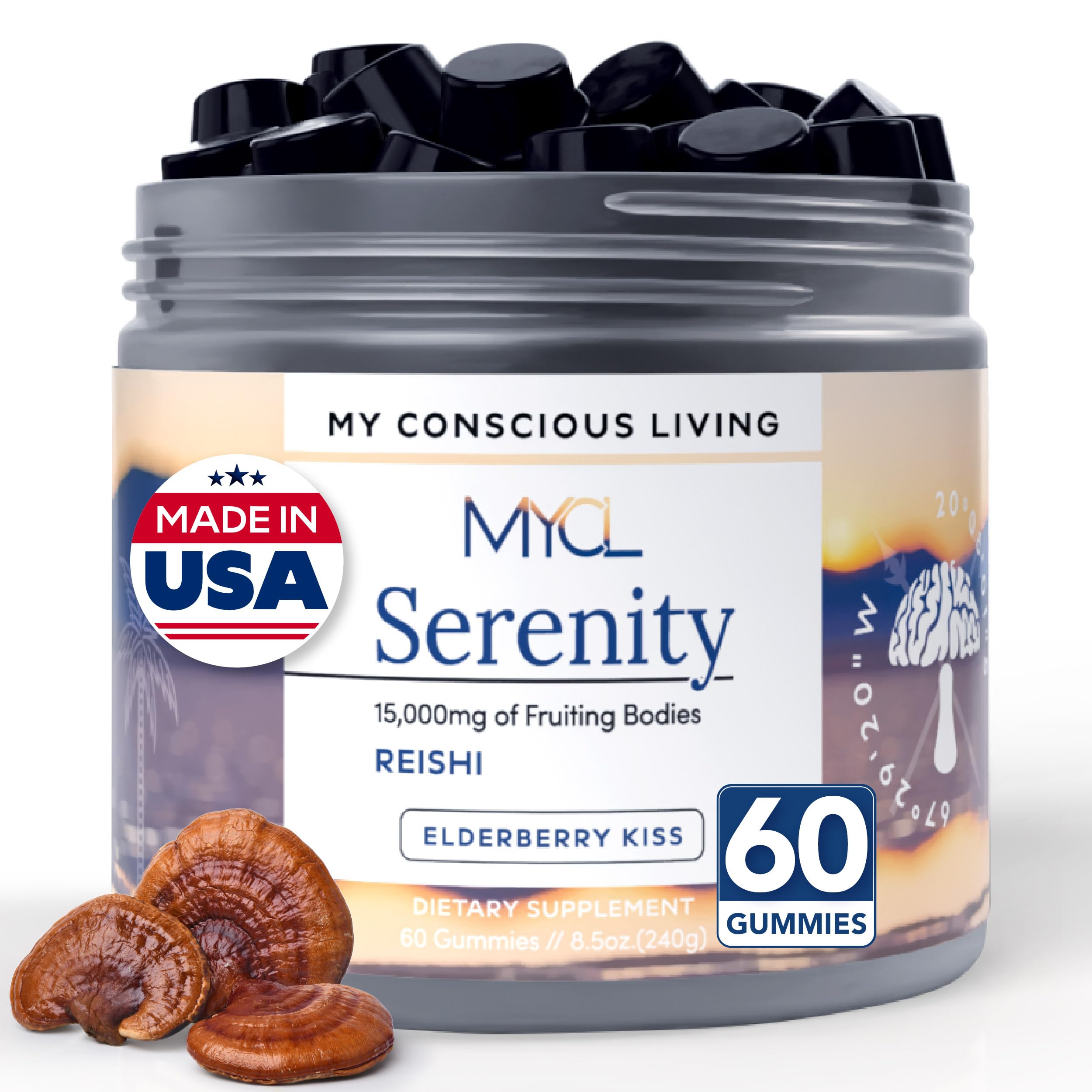 MYCL Serenity Reishi Mushroom Gummies for Adults - 500mg Whole Fruiting Body Extract - Sleep Gummies for Adults and Kids - Vegan, Gluten-Free - Stress Relief, Relaxation - Elderberry Kiss, 60 Count
