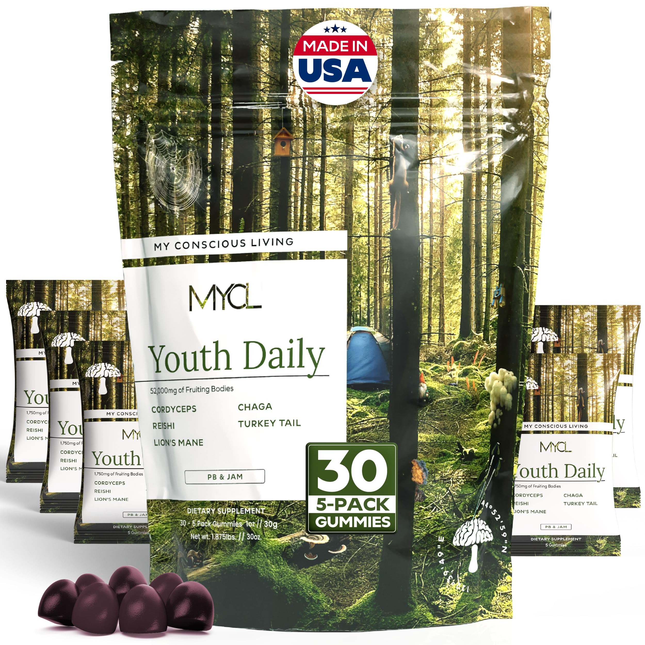 MYCL Youth Daily Vitamin Mushroom Gummies | 500mg Fruiting Body Mushrooms – Cordyceps, Reishi, Lion’s Mane, Turkey Tail & Chaga | Immune & Focus Support | PB & Jam Flavor, 30 Servings (5-Gummy Packs)