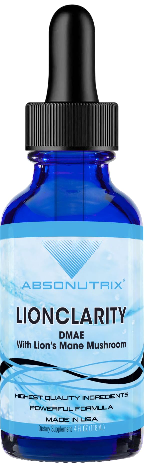 Absonutrix LionClarity Dmae with Lions Mane Mushroom Liquid, 390 mg, 4 FL Oz Liquid, 302 Servings, Made in USA, Plant-Based Ingredients, DMAE, Lion’s Mane, Huperzine A, Green Tea Extract, Non-GMO