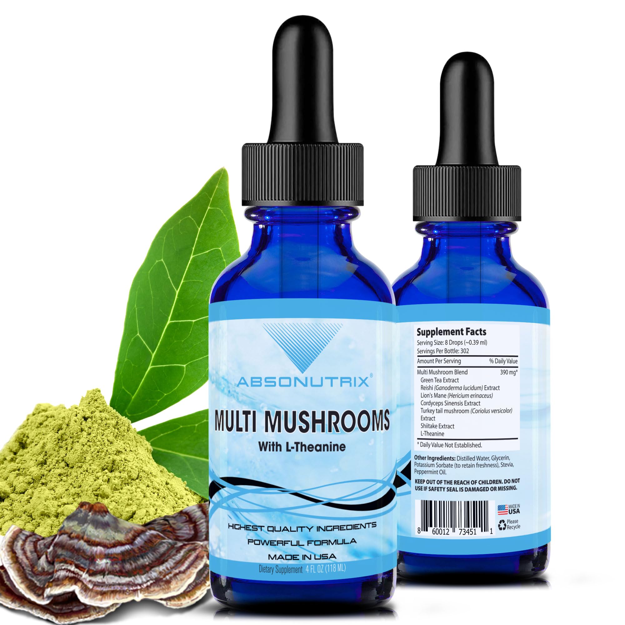 Absonutrix Multi Mushrooms l theanine Supplement, 390 mg, 4 Oz Liquid, 302 Servings, Made in USA, Quick Absorption, Quality Potent Ingredients, Non-GMO, GMP Certified Facility, Cruelty-Free Products