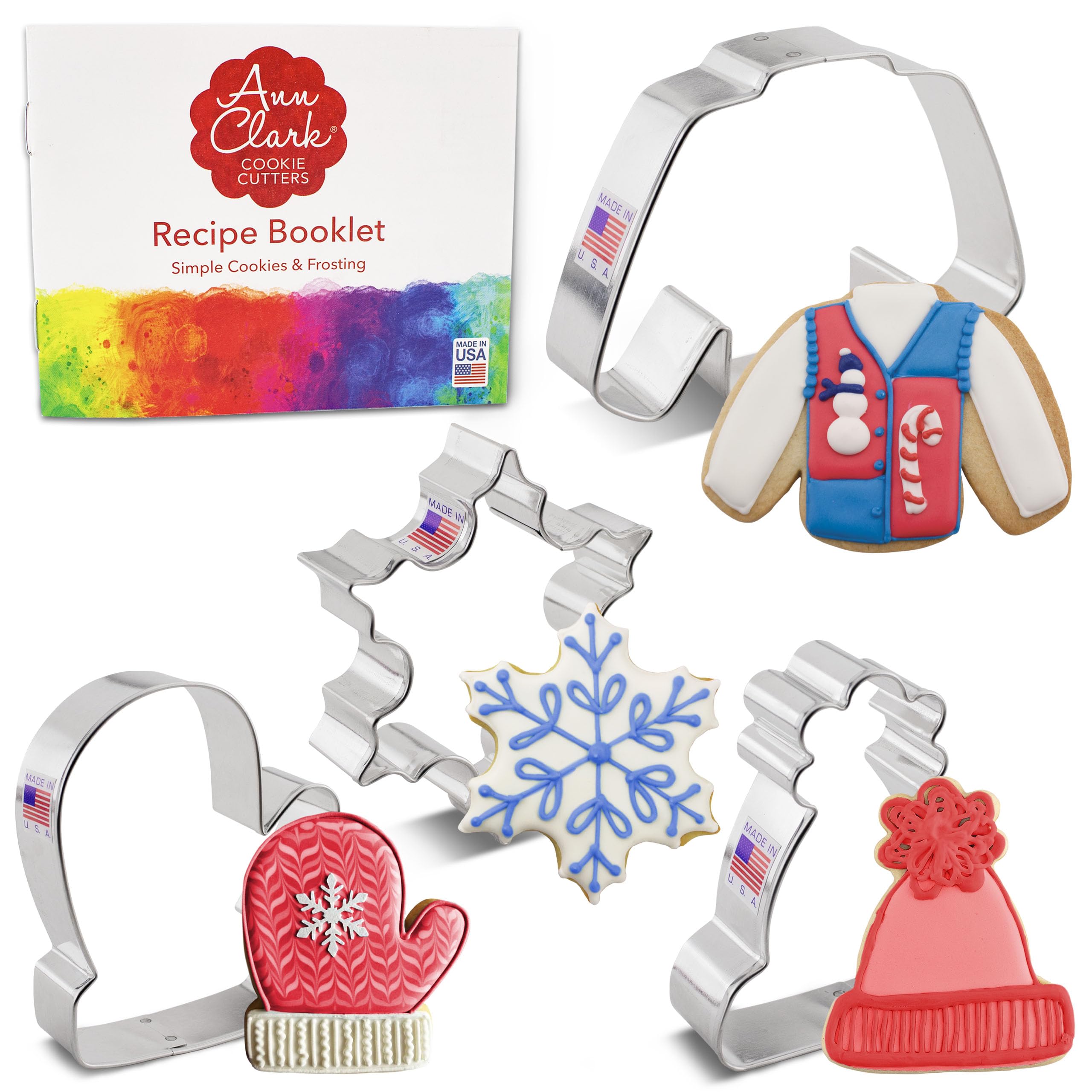 Winter and Christmas Cookie Cutters 4-Pc Set Made in USA by Ann Clark, Snowflake, Sweater, Mitten, Winter Hat