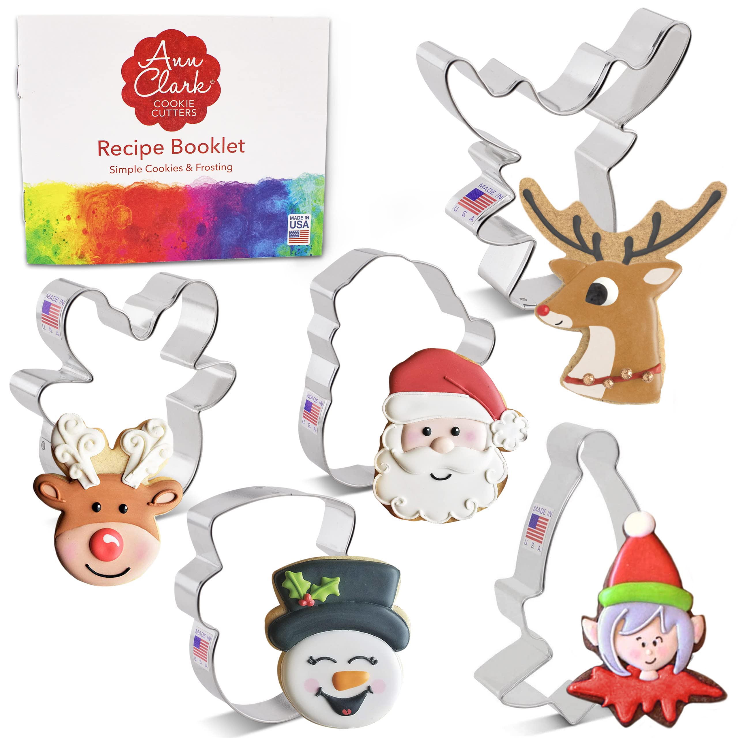 Ann Clark Cookie Cutters Faces of Christmas Cookie Cutters 5-Pc. Set Made in the USA, Santa Face, Reindeer Faces, Snowman Face, Elf Face