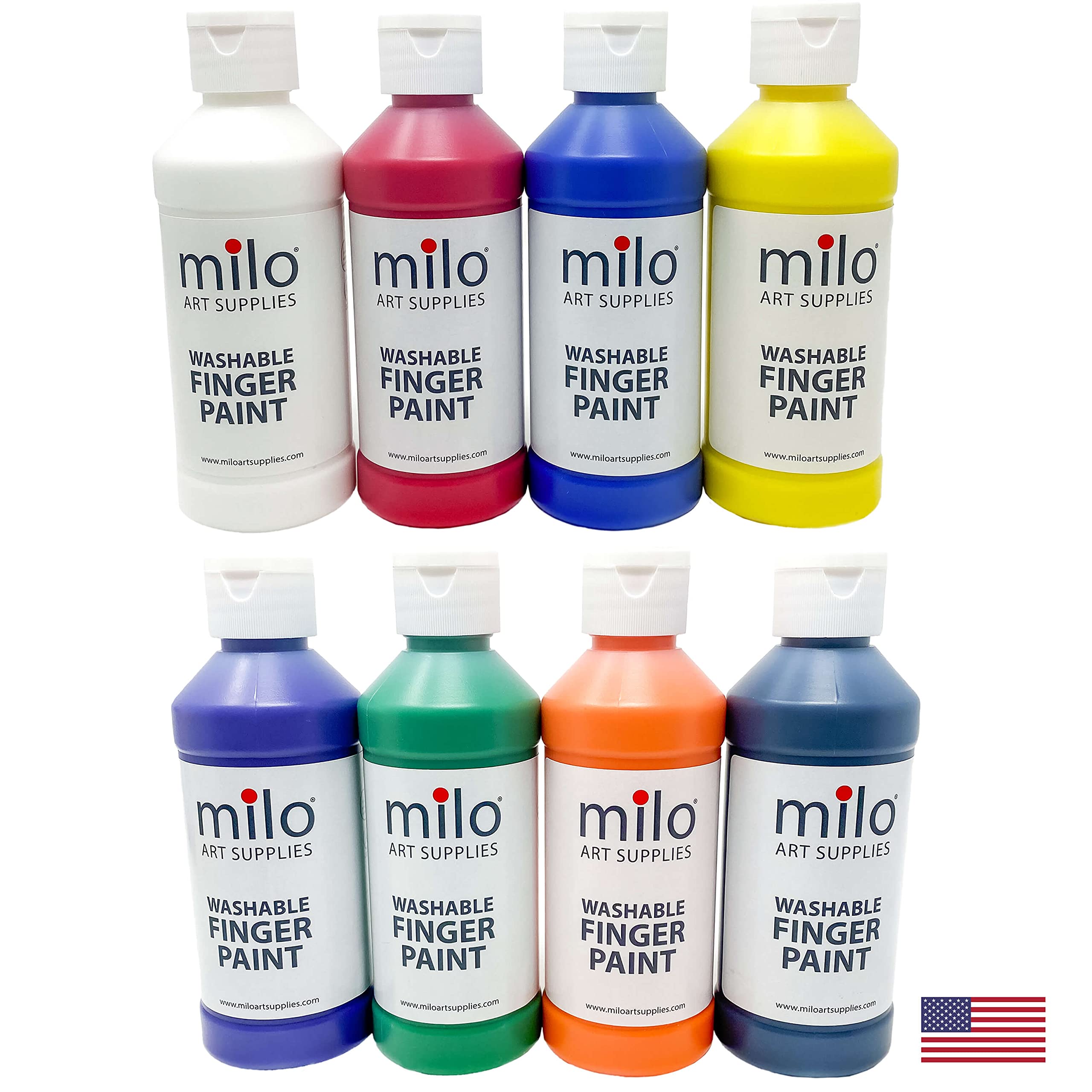 milo Kid's Washable Finger Paint Set of 8 Colors | 8 oz Bottles | Safe and Non-Toxic | Made in the USA | Art & Craft Paints for Kids, Toddlers, Pre School Supplies Painting Set for Children | Easy Pour and Squeeze Bottles