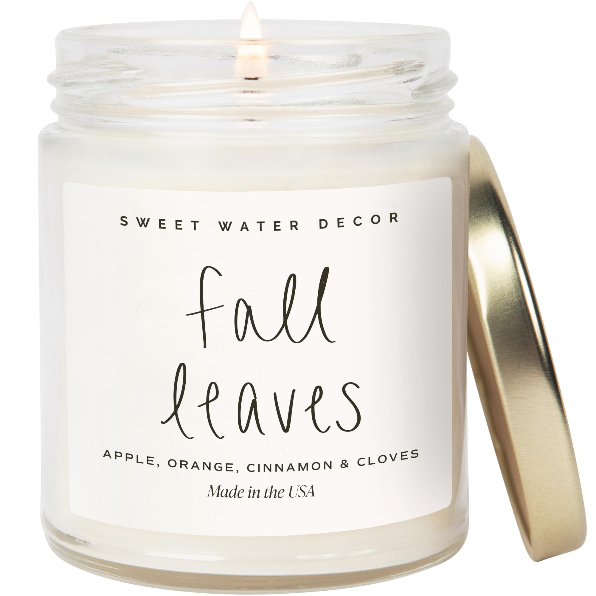 Sweet Water Decor Leaves Scented Candle - Soy Candle with Apple Orange Cinnamon & Cloves Scent - Soy Candle Wax with 40 Hours Burn Time - 100% Cotton Wick Fall Candle Made in USA - Clear Jar 9oz
