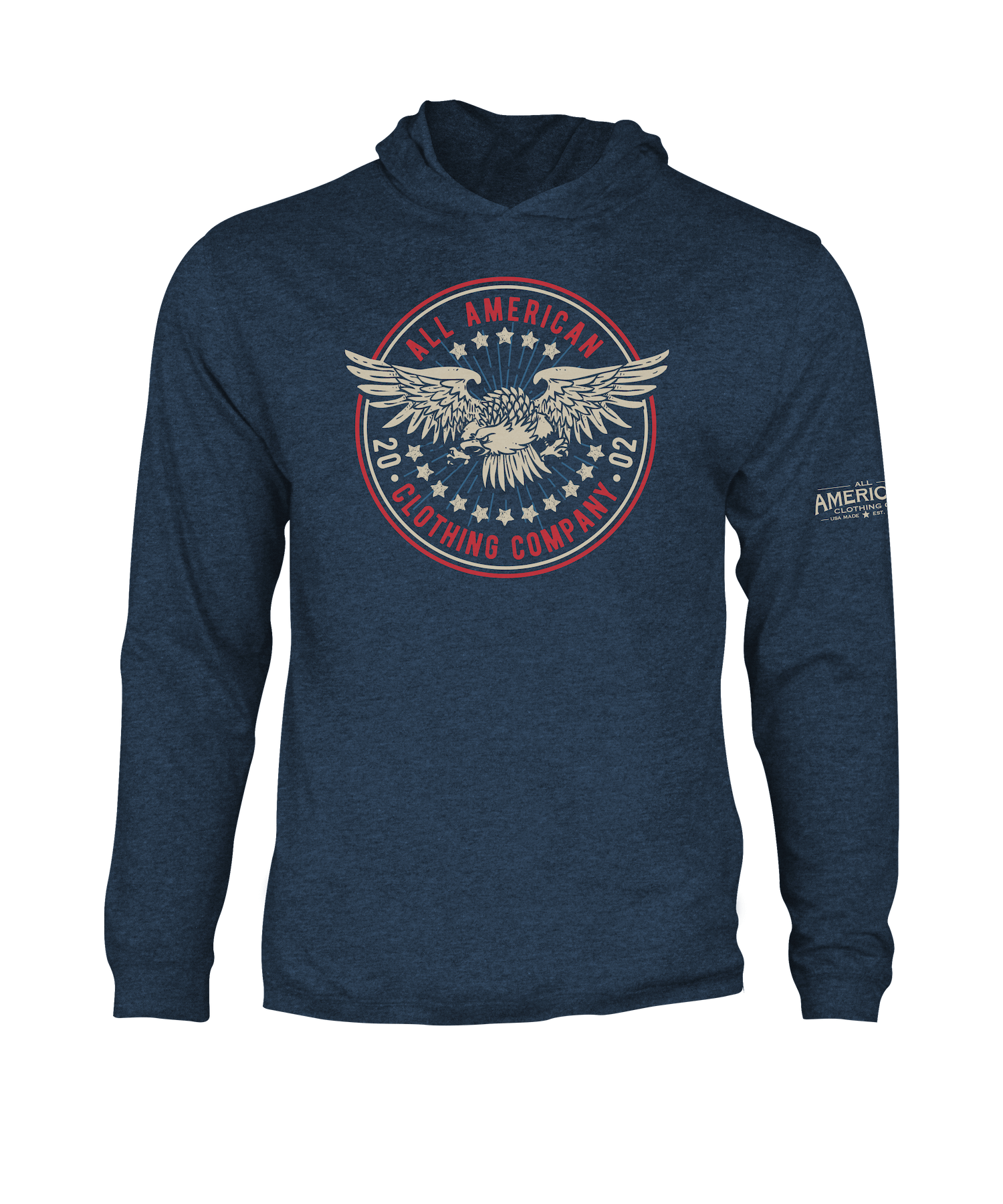 Lightweight, stylish, and incredibly versatile, our Men's Lightweight Hooded Graphic Long Sleeve T-Shirt, in navy, features a vintage eagle graphic...