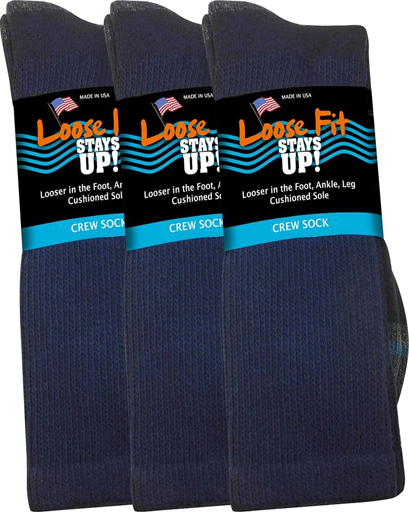 Loose Fit Stays Up Men's and Women's Casual Crew Socks (Pack of 3) Made in USA Cushioned Sole (Large, Navy)