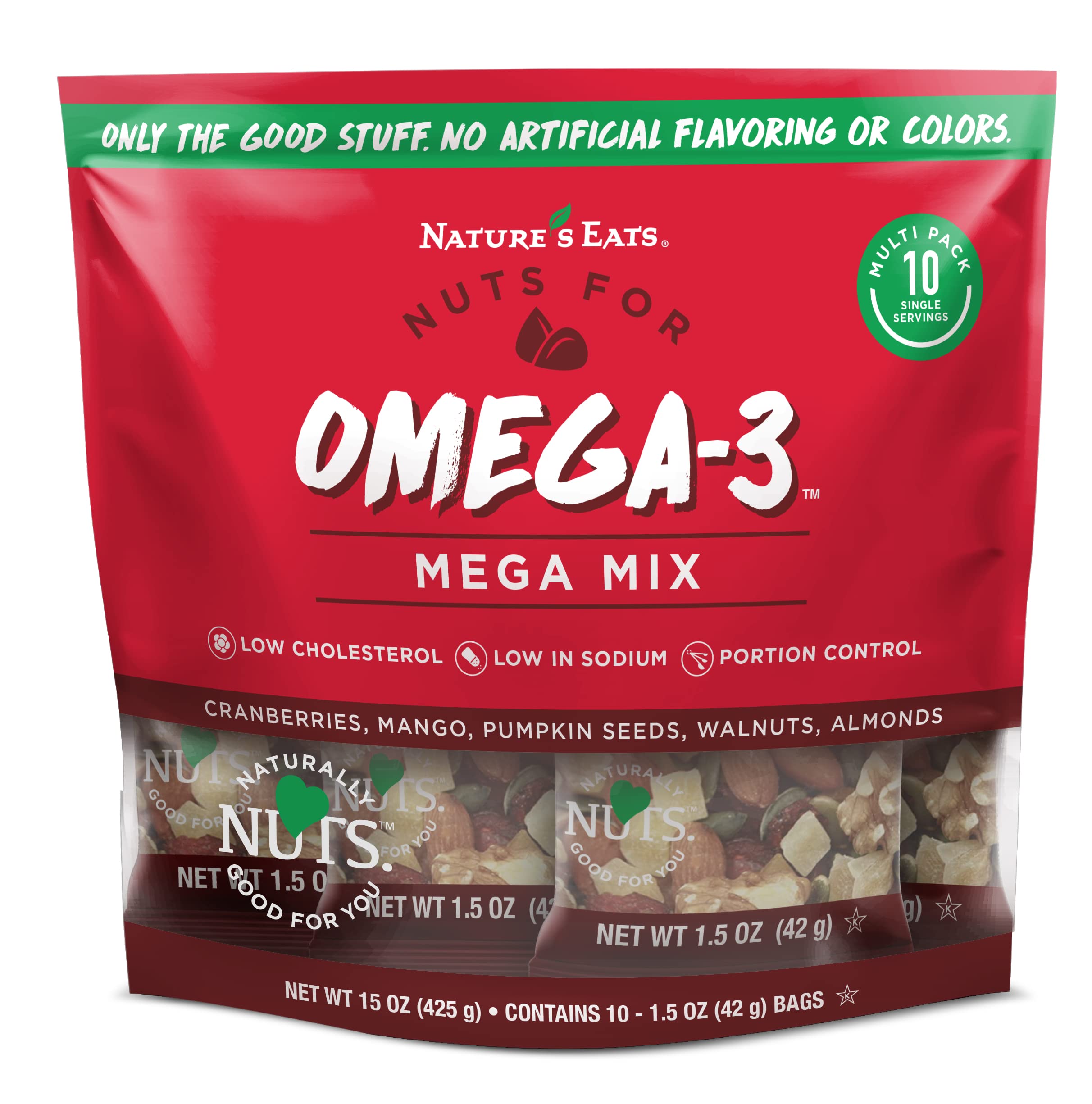 Brand: Nature's Eats Features: Low in sodium Low in cholesterol Portion control Allergen information: tree_nuts Details: Nature's Eats Omega 3...