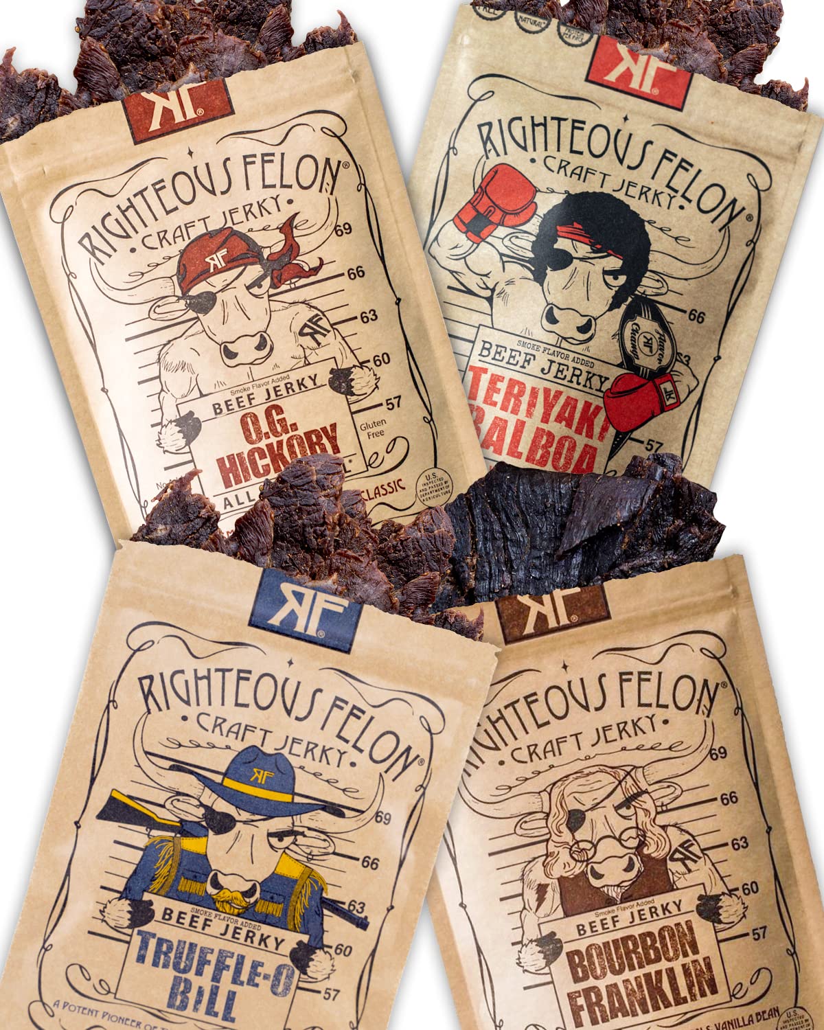 Brand: RIGHTEOUS FELONFeatures: BEEF JERKY: A variety of bold flavors to compliment our high protein packed, mouth watering jerky snacks....