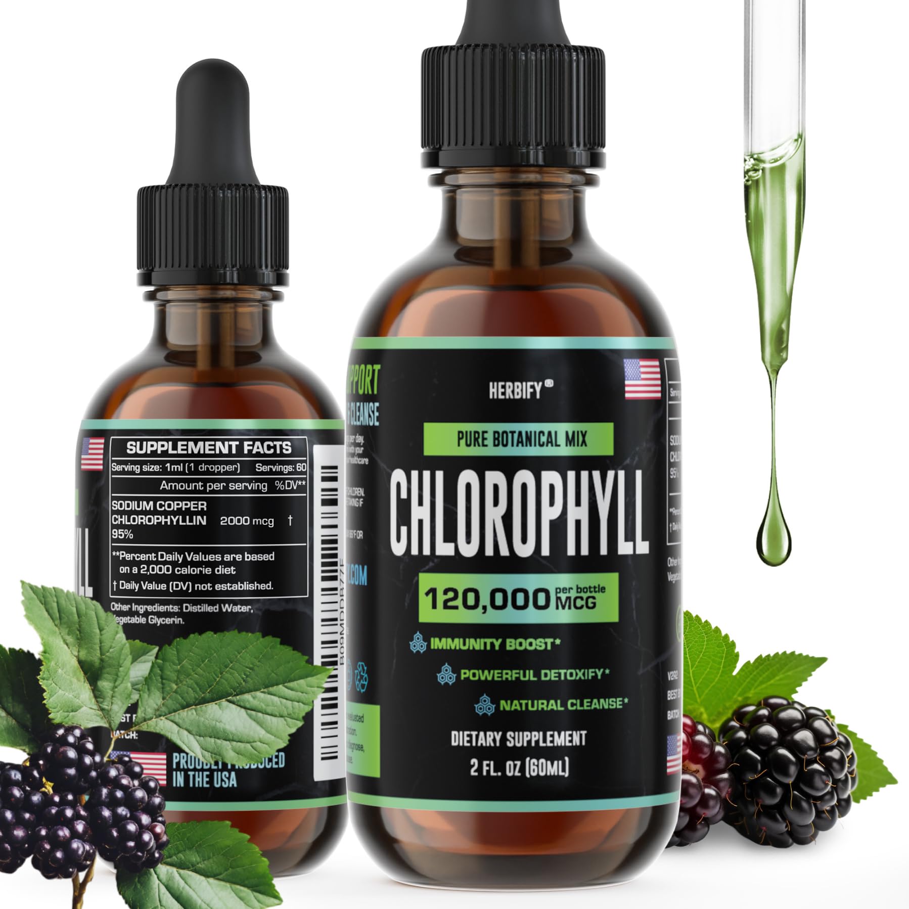 HERBIFY Chlorophyll Drops - Liquid Chlorophyll for Energy Boost & Immune System Support - Made in USA - Chlorophyll Liquid Drops for Body Detox, Internal Deodorant & Enhance Skin - 2 Oz