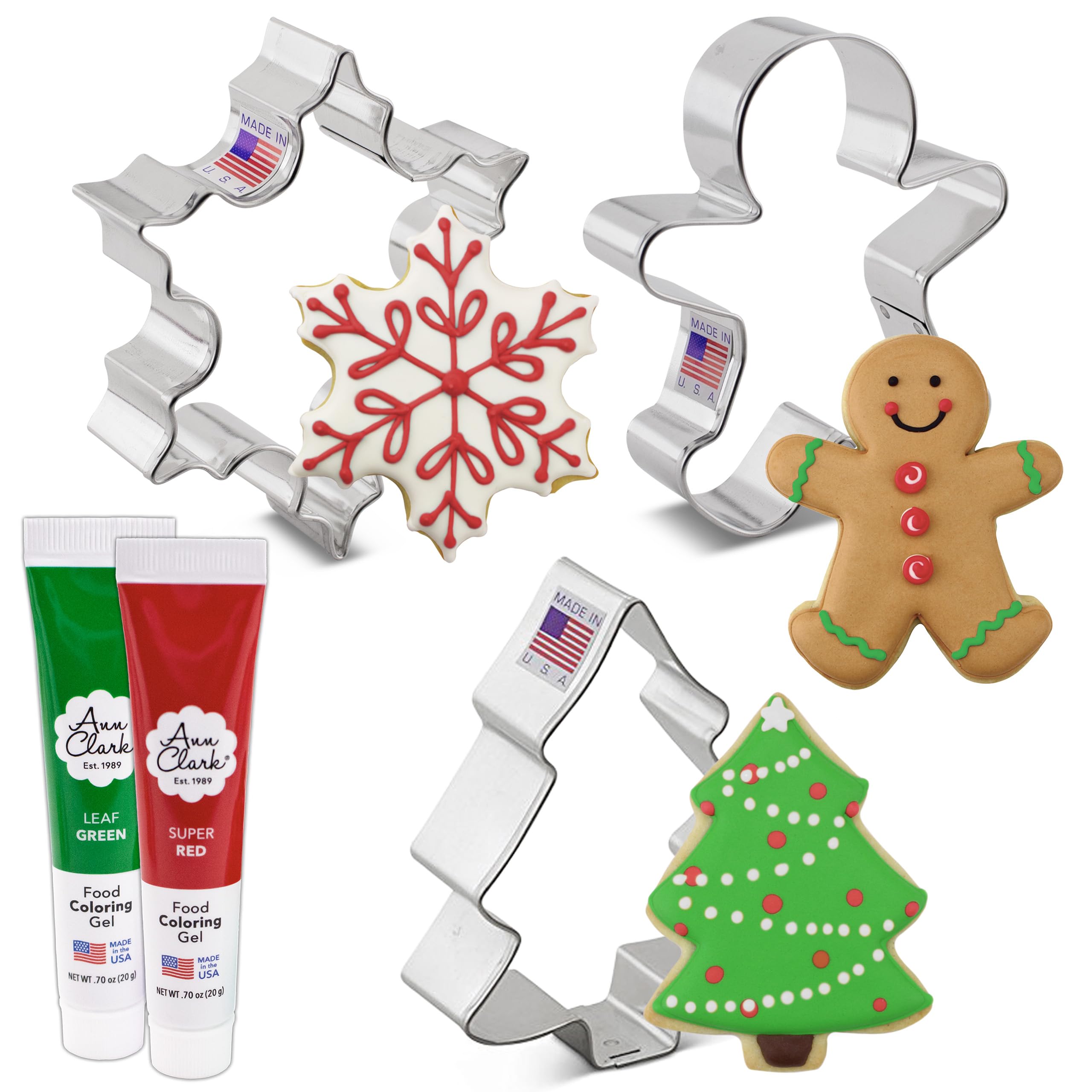 Christmas Cookie Cutters and Decorating 5-Pc. Set Made in USA by Ann Clark, Snowflake, Gingerbread Man, Christmas Tree, Red & Leaf Green Food Coloring Gel