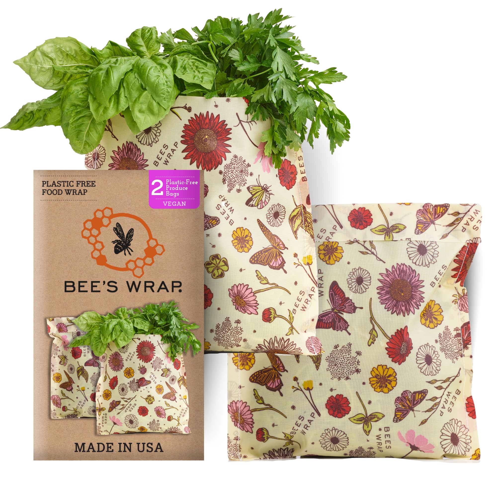 Bee's Wrap Reusable Vegan Alternative to Beeswax Food Wraps Made in the USA, Eco Friendly, Sustainable Food Storage Containers, 2 Reusable Produce Bags, Meadow Magic Print