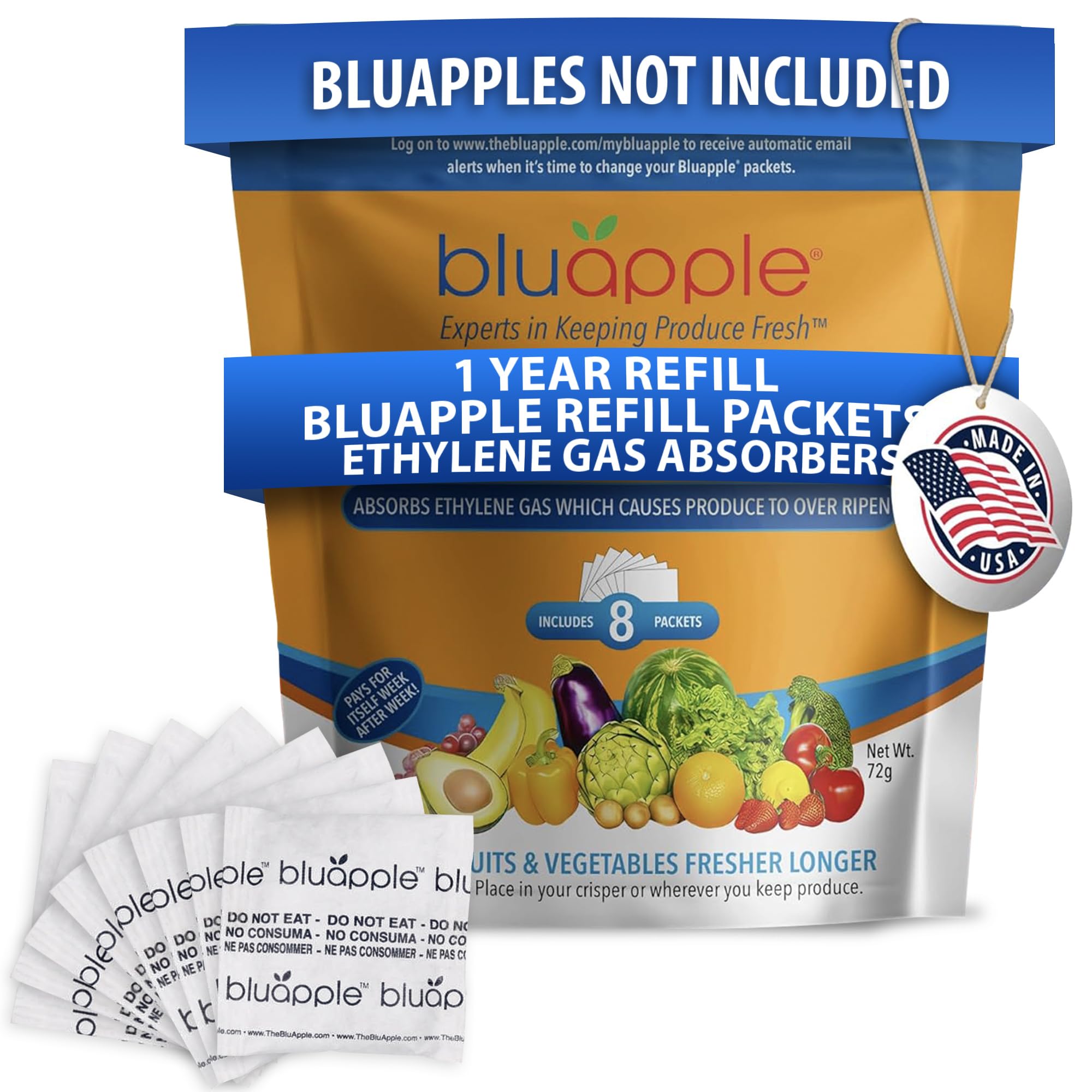 Bluapple Produce Saver Refill Kit - Keep Fruits & Vegetables Fresh Longer, Veggie & Fruit Saver, 8 Packets (9 grams each), Lasts up to 3 Months, Produce Storage, Ethylene Gas Absorber, Made in USA