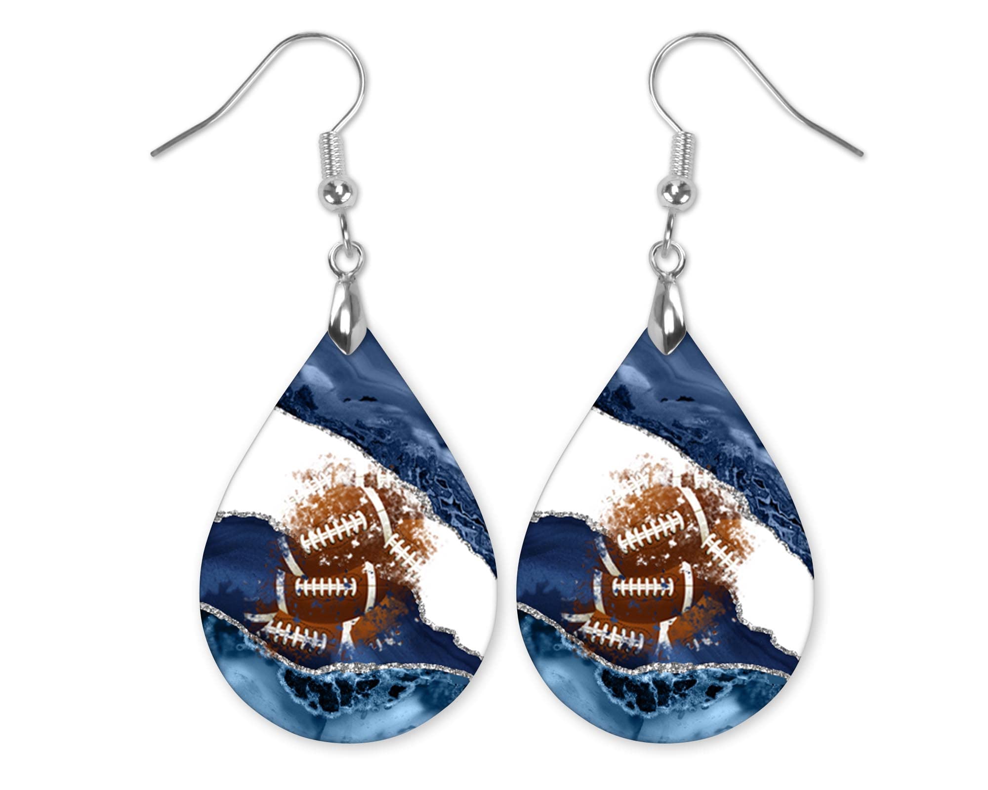 Football Dangle Earrings Blue & White Teardrop MDF Wood Sports School Team Spirit Fan Jewelry Gift for Women Handmade by The Painted Pug (Blue White Silver)