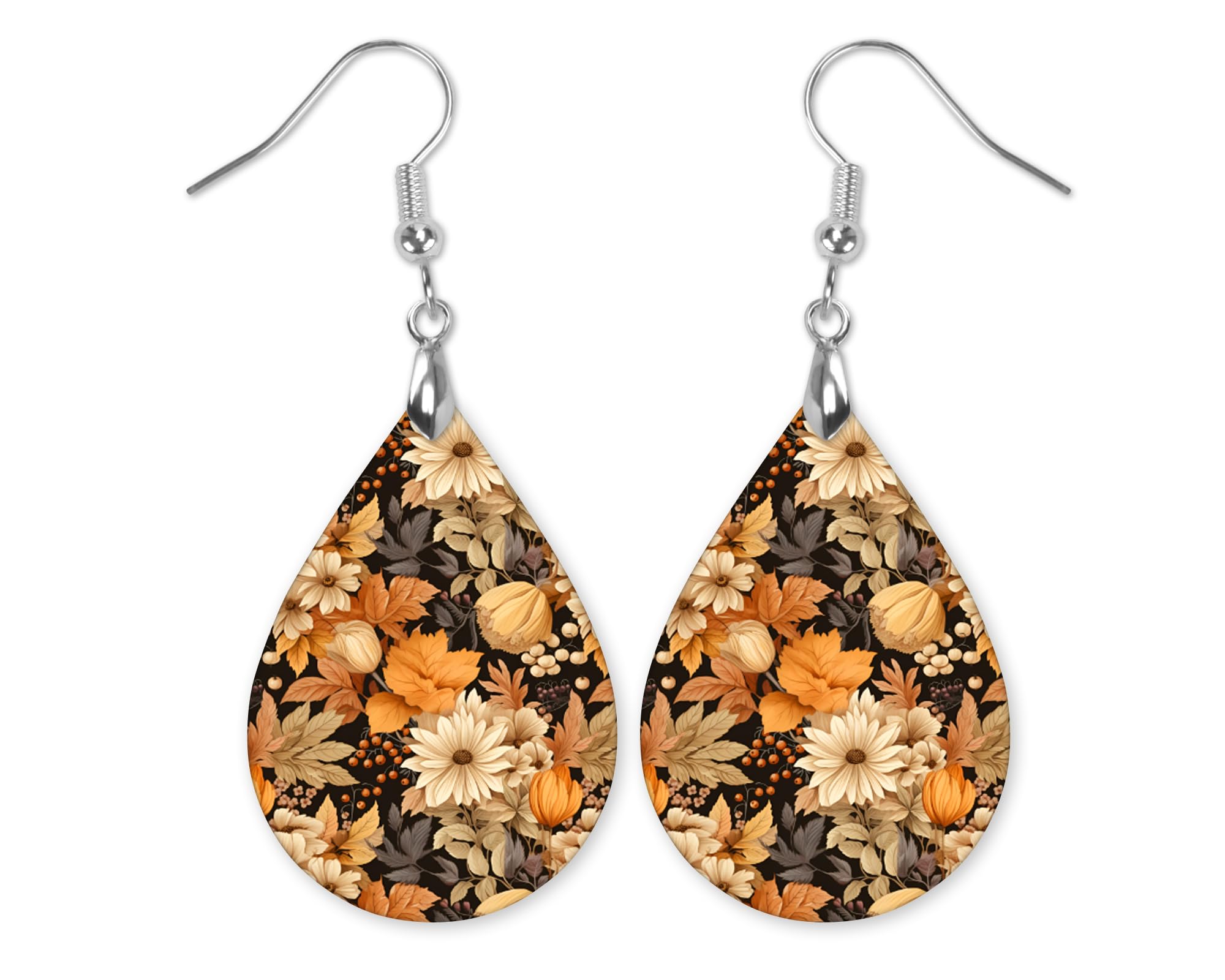 Floral Fall Earrings for Women Thanksgiving Autumn Lightweight Teardrop Dangle Fun Colorful Statement Jewelry Handmade by the Painted Pug (Fall Floral Org Blk)