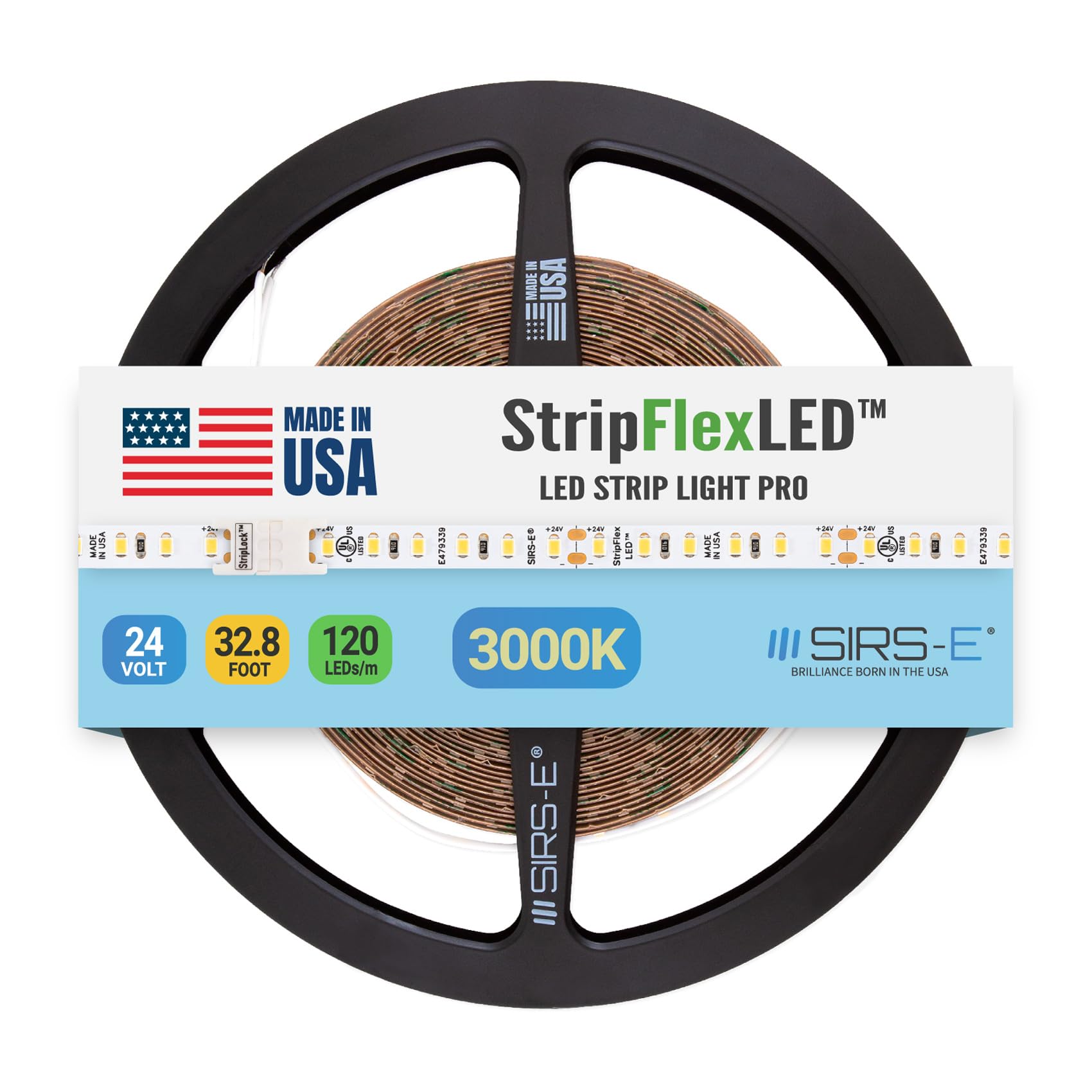 SIRS-E White LED Strip Lights, StripFlexLED Professional Grade Flexible Tape, 24V 120 LEDs/m for Versatile Lighting, Made in USA, UL Listed Soft White 3000K 32.8 ft. 10m