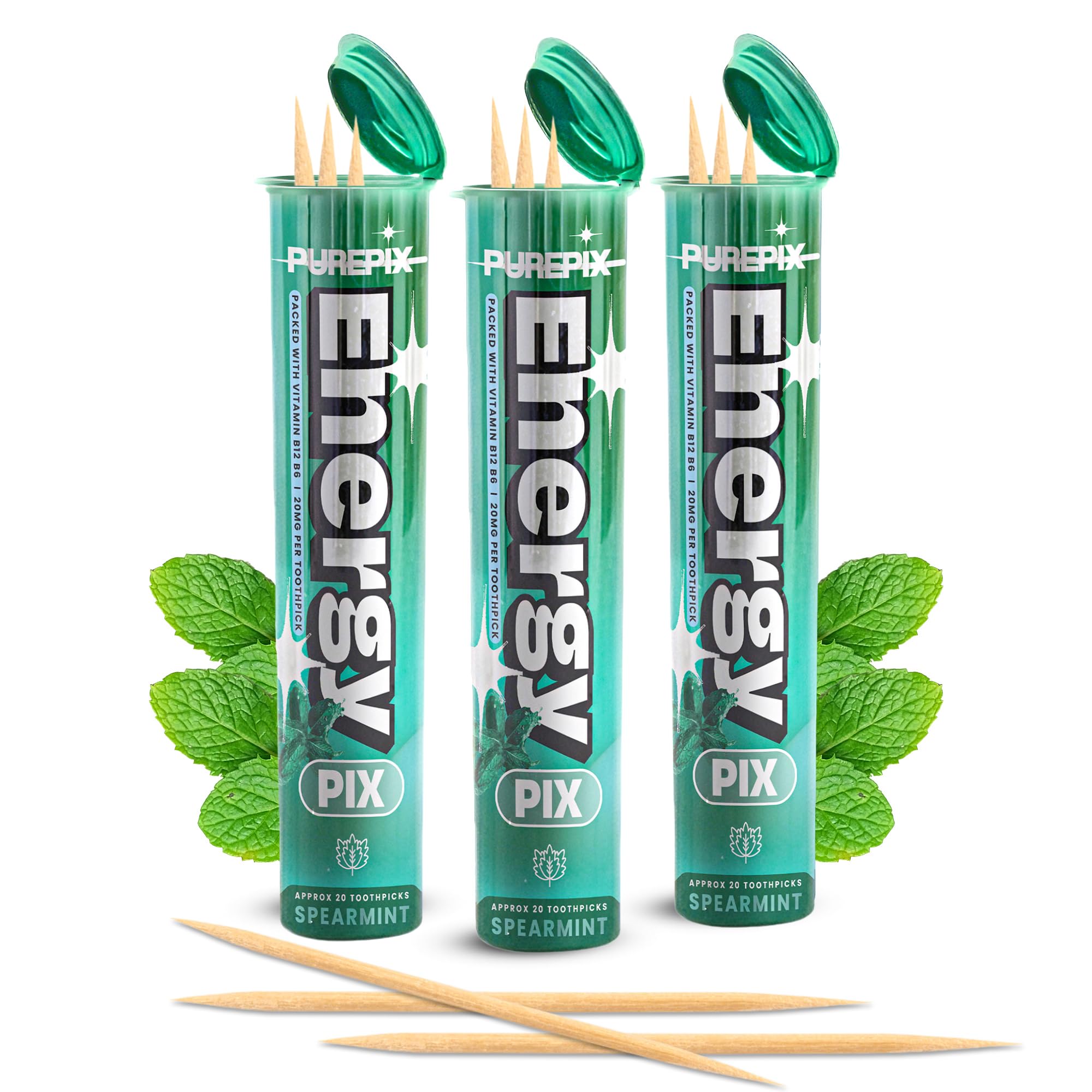 EnergyPix - Caffeine Flavored Toothpicks with L-Theanine, B12 for Focus & Energy - Sugar-Free Alternative to Energy Mints & Gum - 20 Count, Kosher (Spearmint 3 Pack)