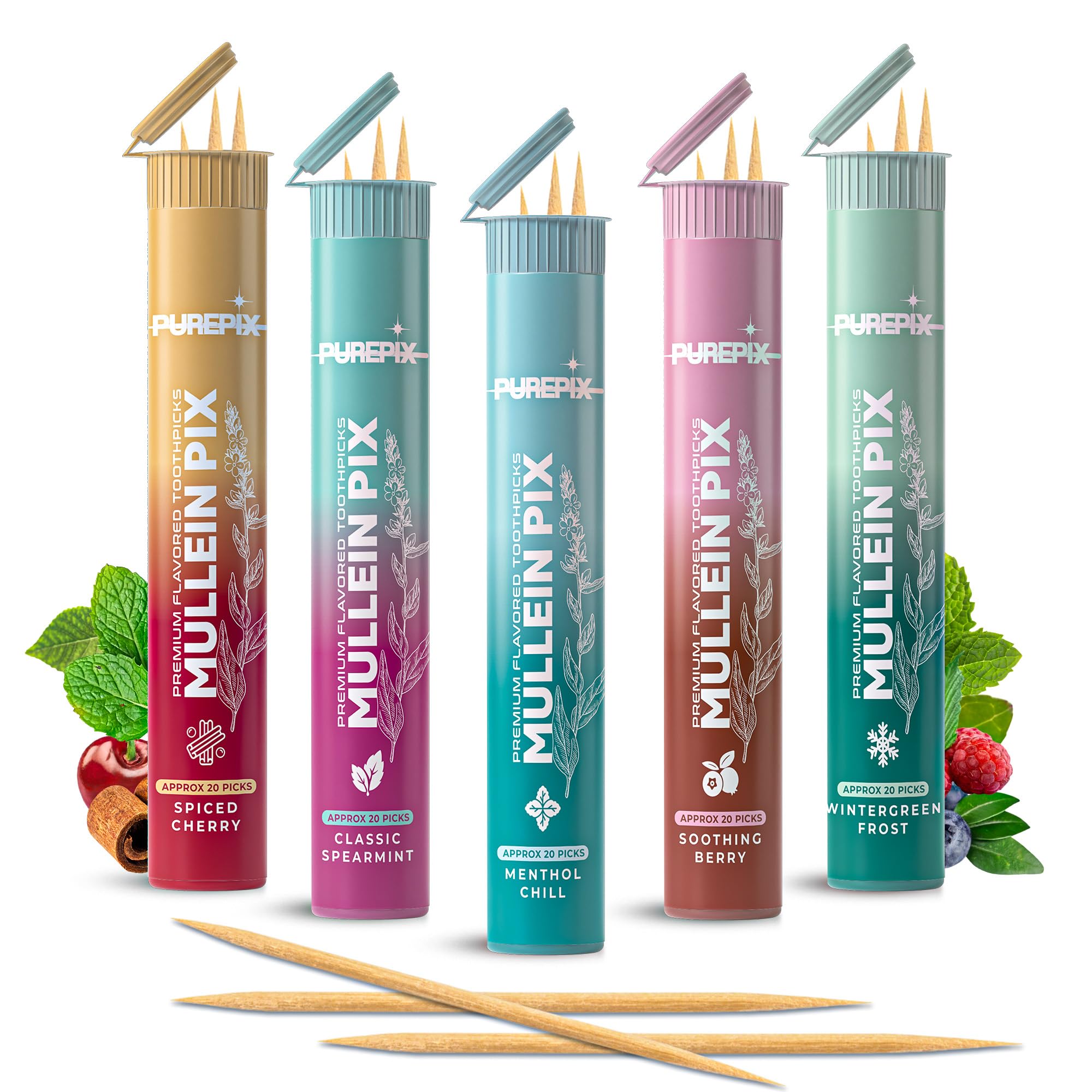 Mullein Pix, Extra Thick Flavored Toothpicks Infused with Mullein Leaf, Natural Quit Smoking Alternative, Lung Cleanse Support, Nicotine Free, Kosher Vegan, Made in The USA, (5 Variety Pack)