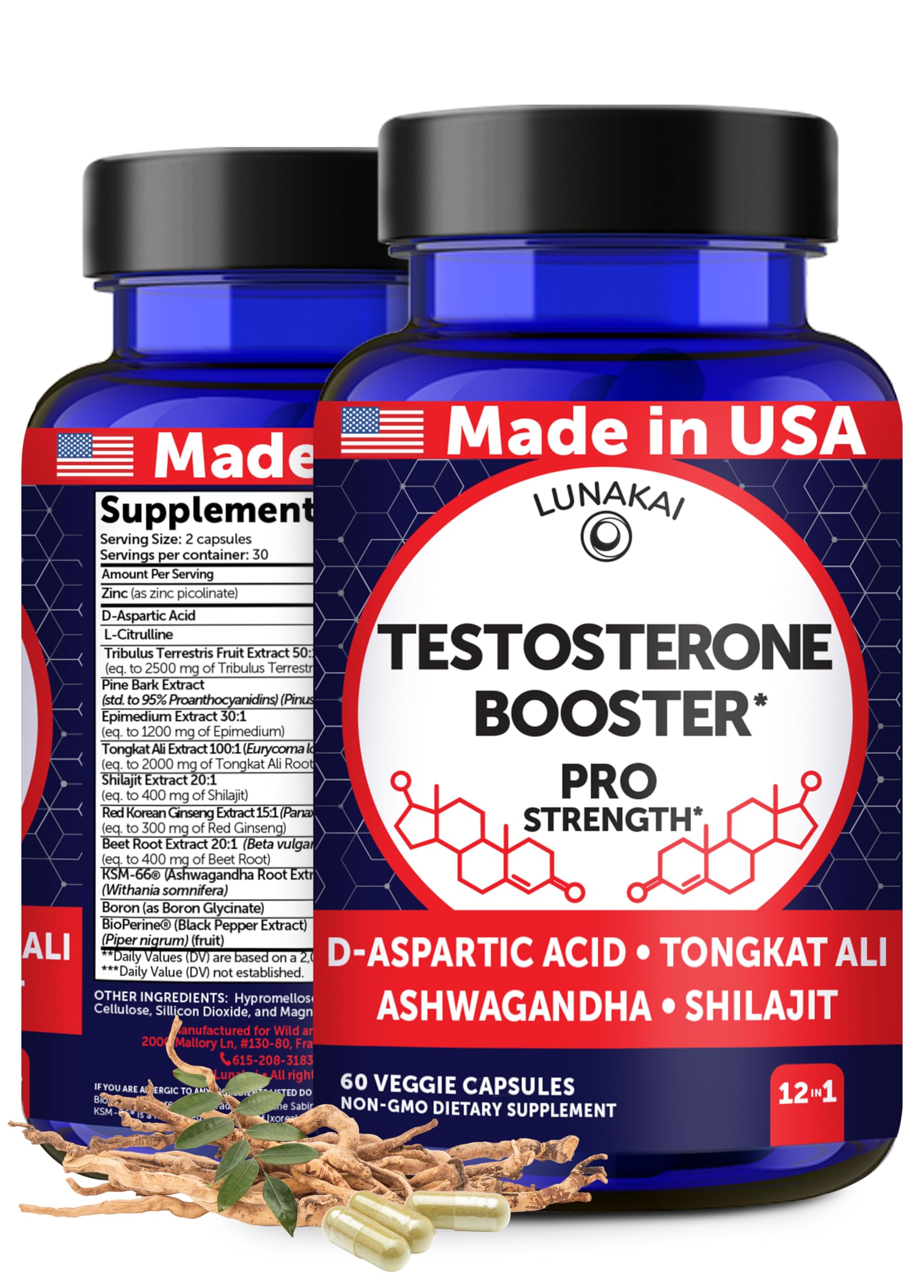 Lunakai USA Made Natural Testosterone Booster for Men with Tongkat Ali, Ashwagandha & Shilajit - Testosterone Supplement for Strength, Energy & Stamina, 60ct