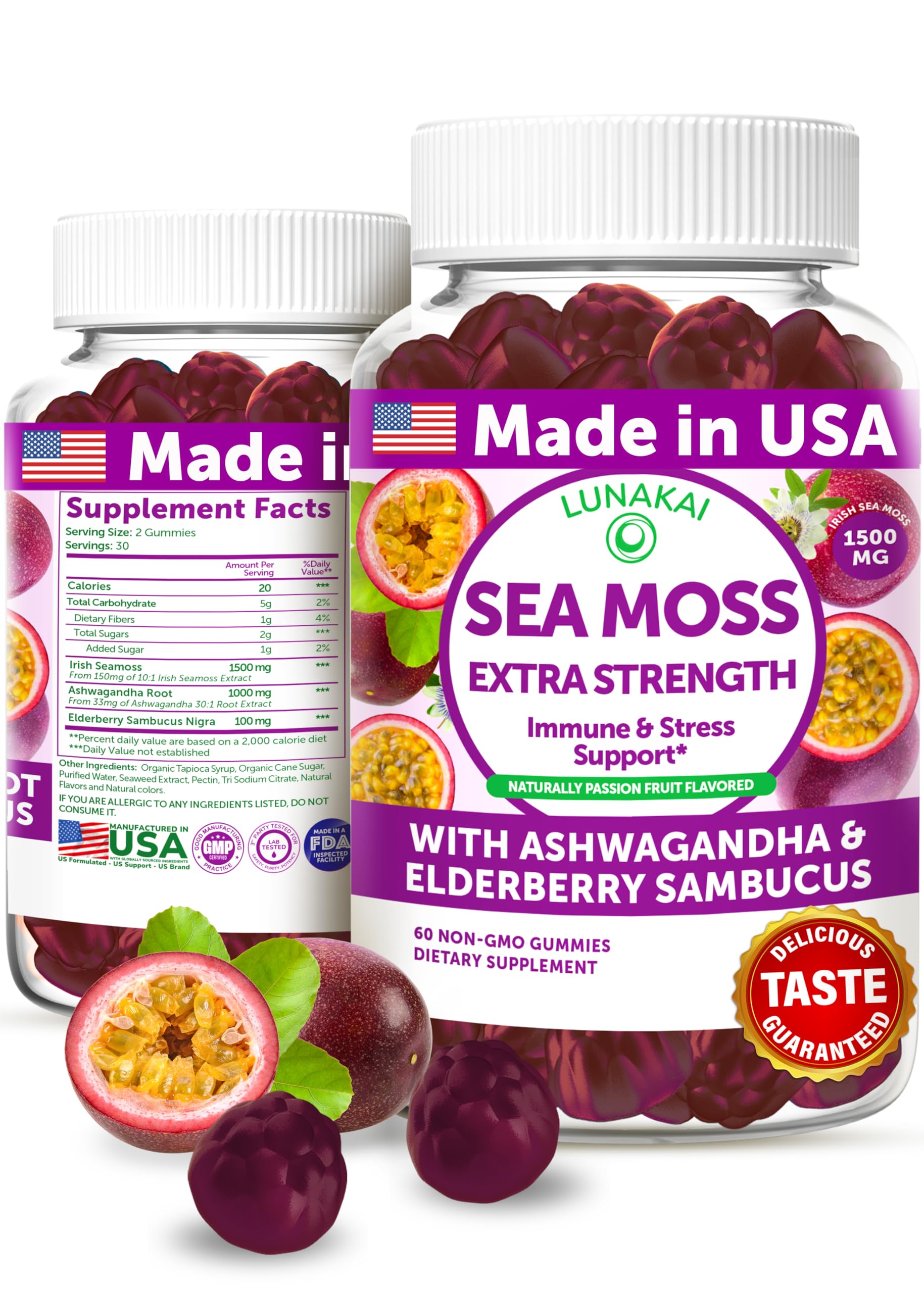 Lunakai USA Made Irish Sea Moss Gummies with Ashwagandha & Elderberry – Delicious Immune & Stress Support Supplement for Men & Women, 60ct