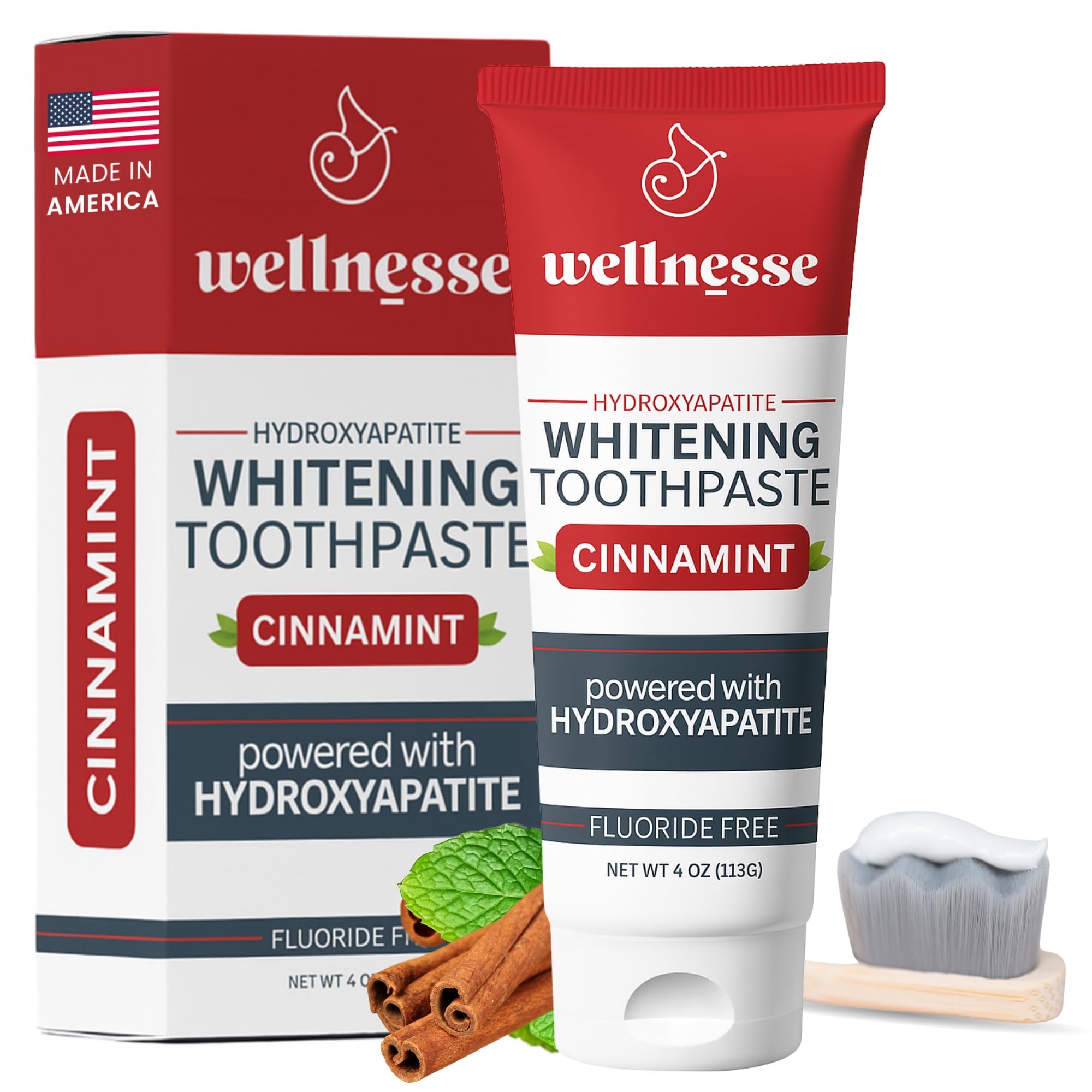 Wellnesse Hydroxyapatite Toothpaste – Fluoride Free for Sensitive Gums – Anti-Plaque, Remineralizing, Enamel Protection & Natural Whitening Toothpaste for Adults – Cinnamint Flavor - 4 oz