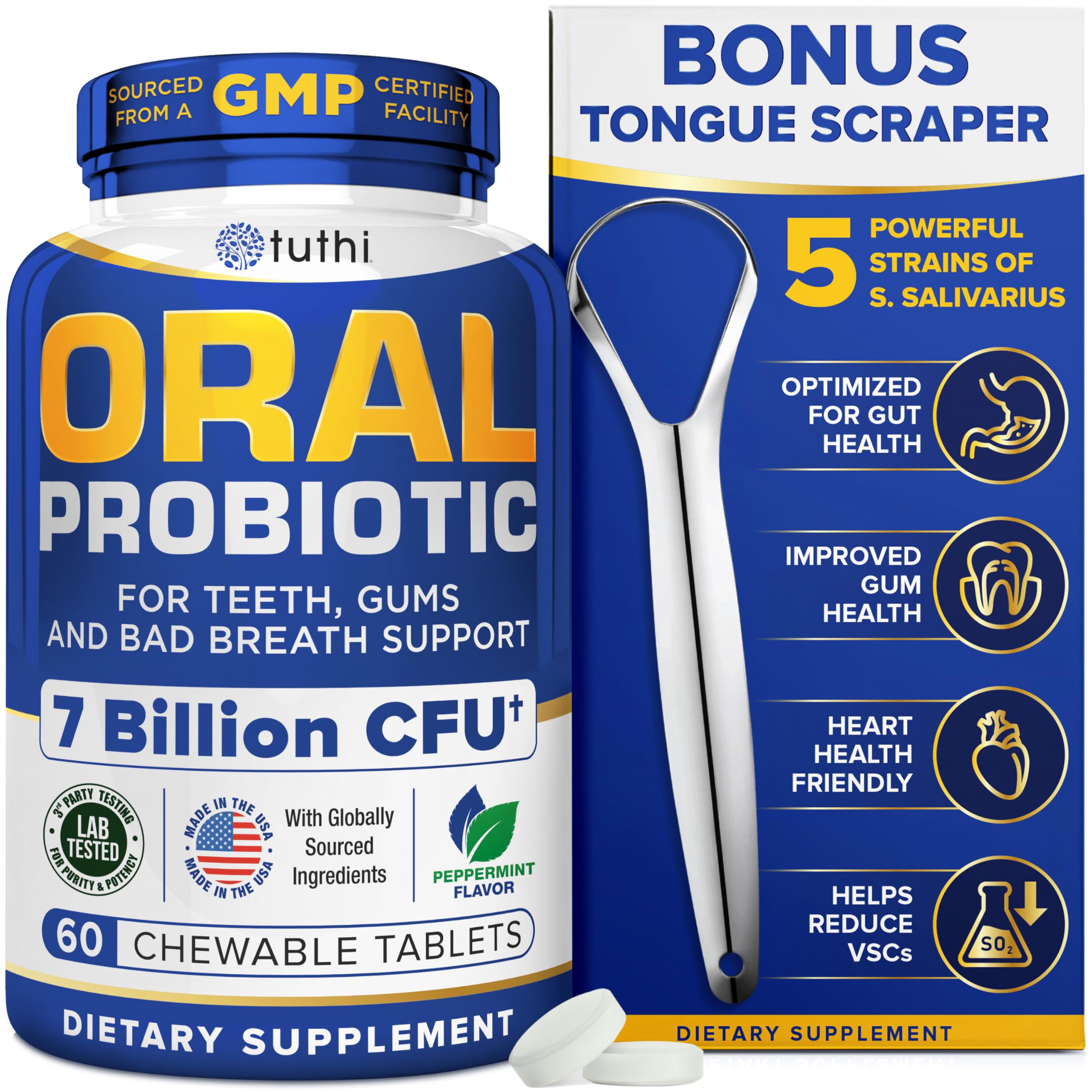 Tuthi Oral Probiotics & Tongue Scraper – Bad Breath Treatment for Adults – Dental Probiotics for Teeth and Gums – Supports Fresh Breath – 60 Chewable Tablets