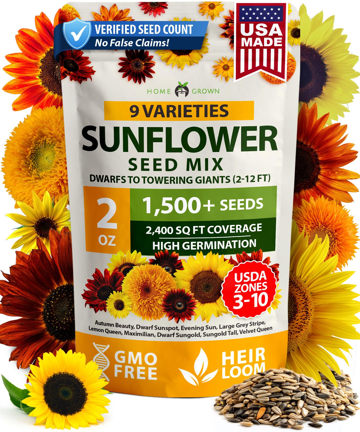 HOME GROWN Sunflower Seeds Mix Pack 1,500+ 9 Colorful Varieties of Sun Flower Seeds to Plant - 2-10ft Tall Plants, Pollinator Friendly π‘π’π‘-ππ π’ π¨π¦π β Easy to Grow, High Germination