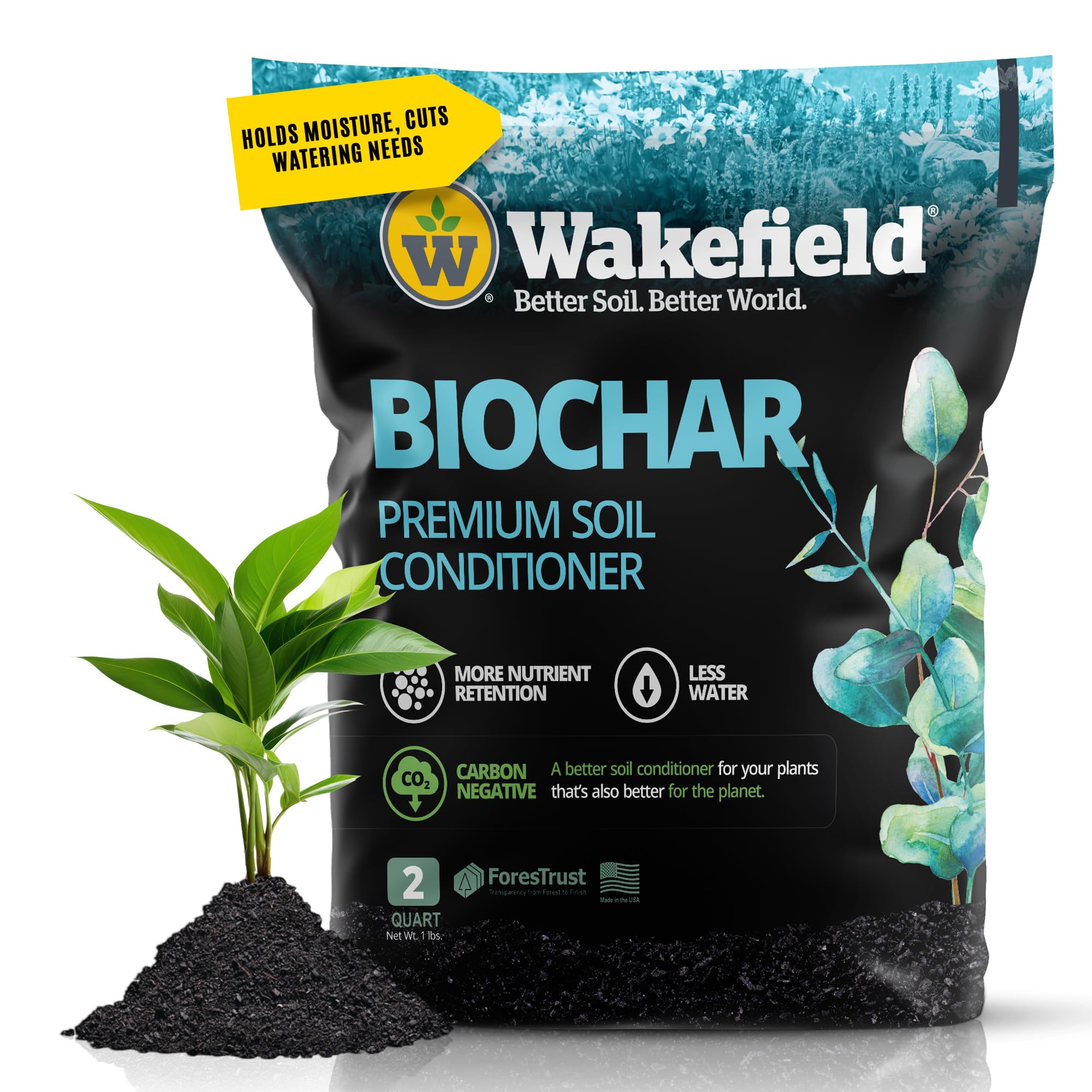 Wakefield Premium Organic Biochar Soil Amendment & Soil Conditioner – Certified Carbon-Negative Nutrient-Locking, Water-Efficient Bio Char for Plants & Lawns - Soil Amendments for Lawn - 2 Quart
