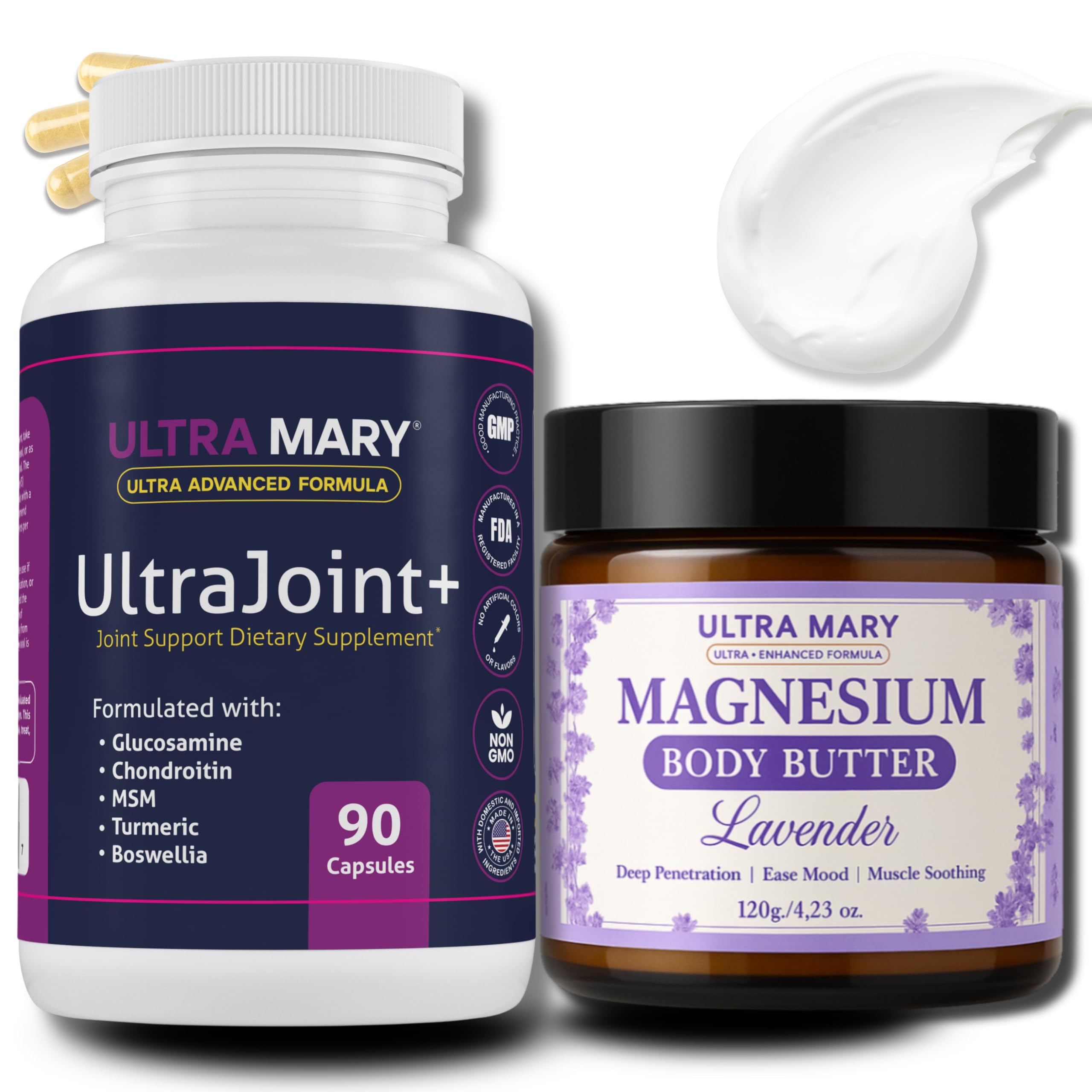Joint Support UltraMary+(90 Capsules)+Magnesium Body Butter(4.23oz) Glucosamine 1500mg,Chondroitin, MSM, Turmeric & Boswellia–Muscle & Joint Relief Combo, Lavender Scent–Articulaciones & Músculos