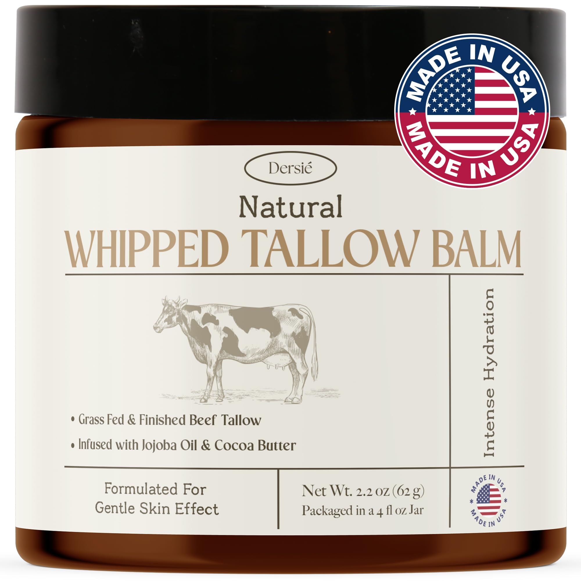 Dersie Organic Beef Tallow for Skin: Made in USA - 3 Natural Ingredients Only - 100% Grass Fed Whipped Tallow Balm for Face & Body - Deep Hydration Moisturizer for All Ages & Skin Types (4 fl oz)