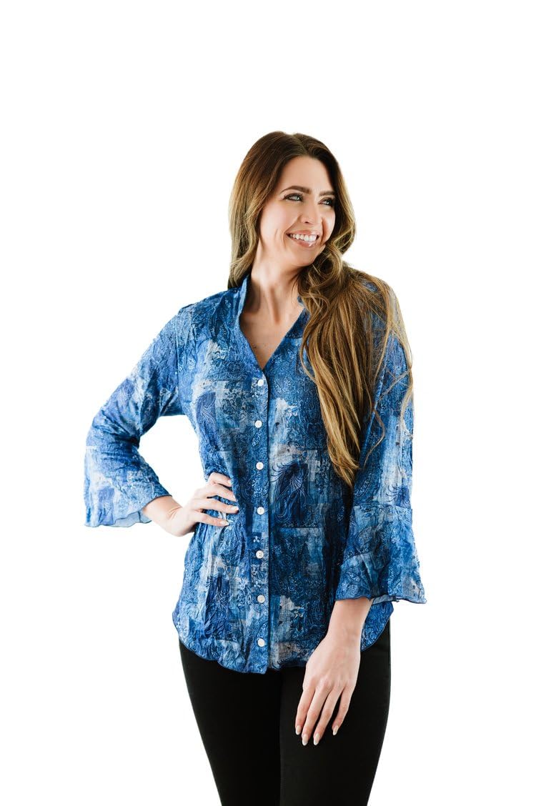 SNO SKINS Spring/Summer Collection Designer Print Crinkle Sweetheart Top with Stand Collar (Denim Love)
