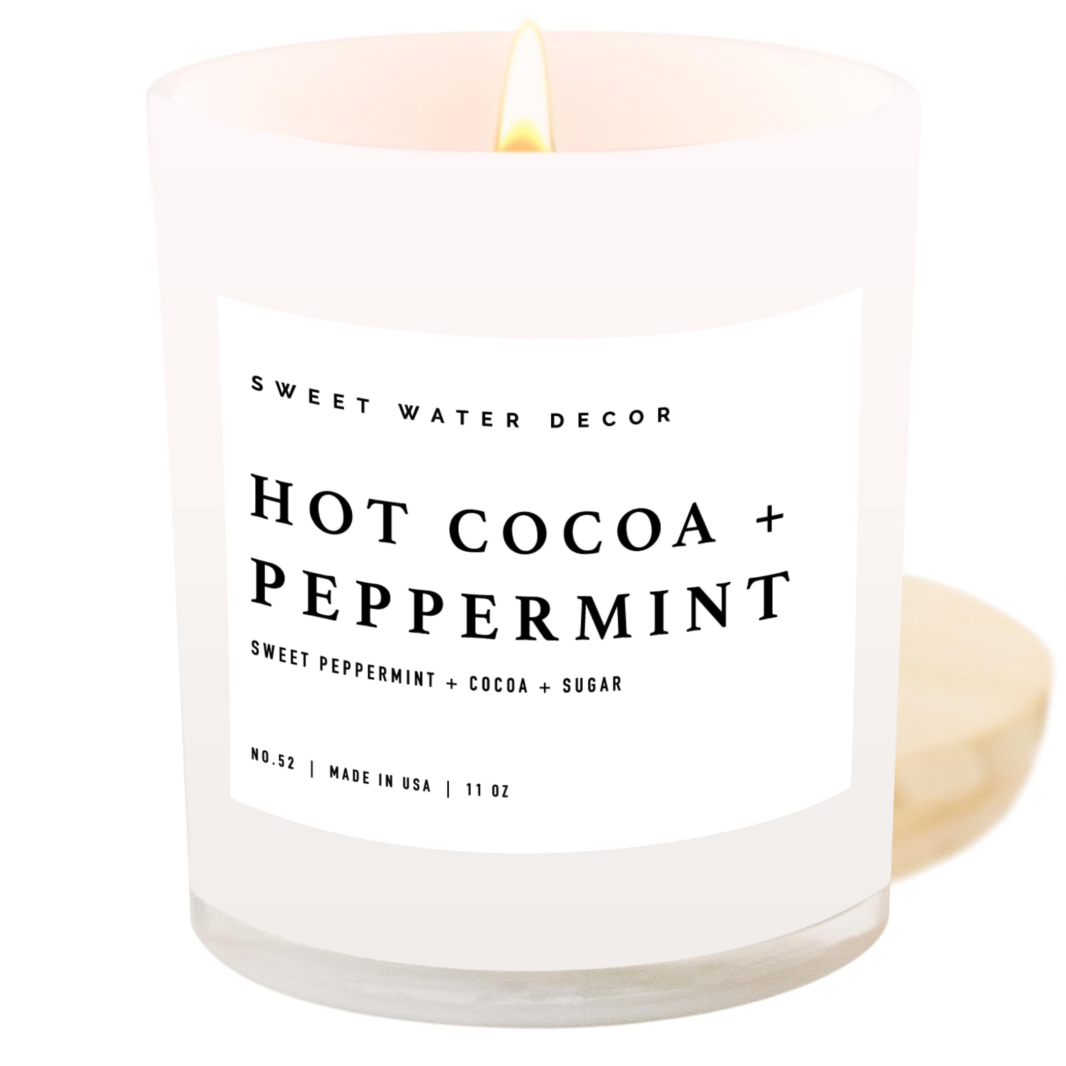 Sweet Water Decor Hot Cocoa + Peppermint Soy Candle | Chocolate, Peppermint, and Vanilla Holiday Scented Candles for Home | 11oz White Jar + Wood Lid, 50+ Hour Burn Time, Made in The USA