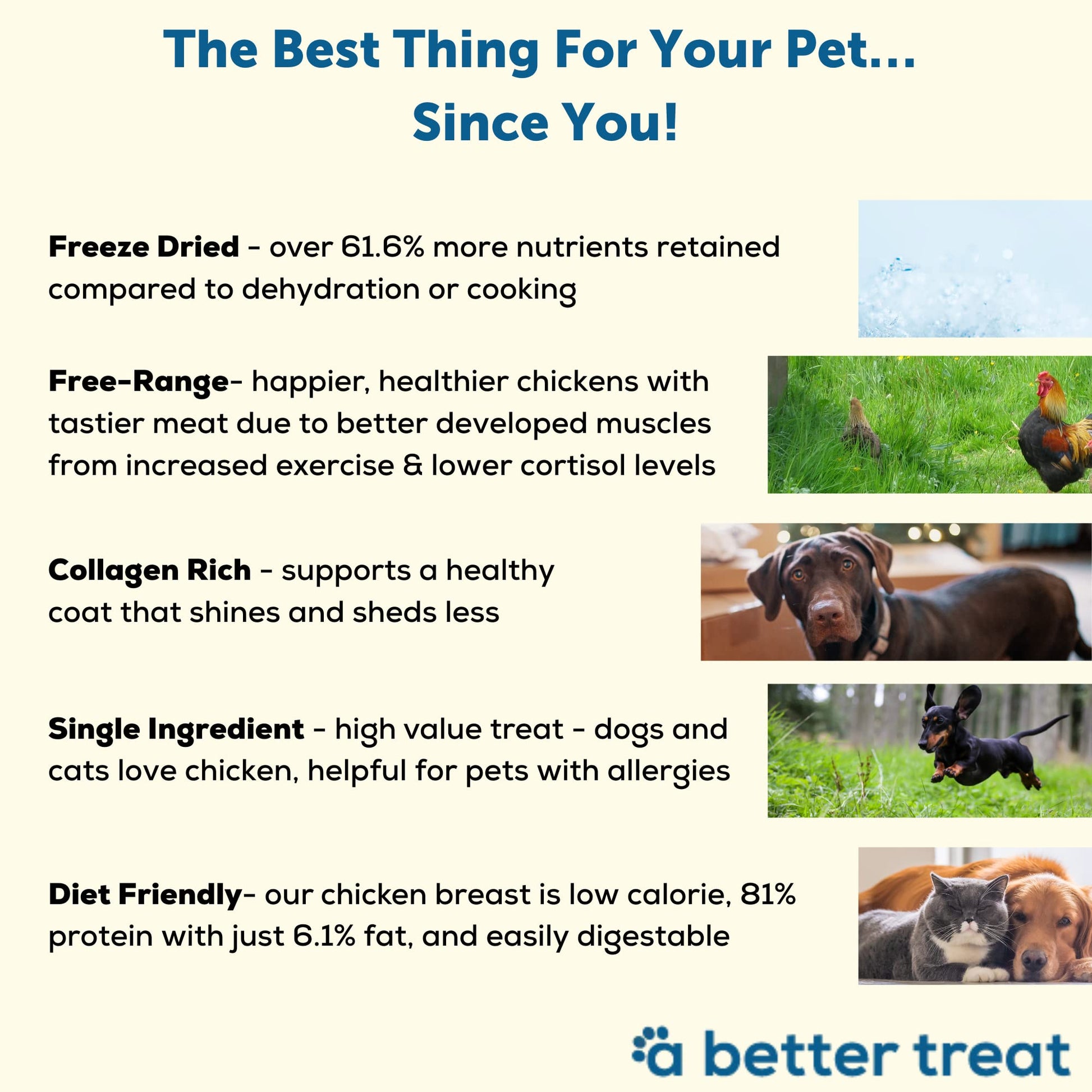 - A BETTER TREAT, YOU CAN TRUST – Our treats are made in the USA at our FDA regulated facility to ensure human grade quality. Freeze drying is shown to be the best way to preserve natural nutrients with over 61% more nutrients retained relative to dehydration or cooking. Our mission is to ensure only the freshest, healthiest, and best quality ingredients to make A BETTER TREAT.