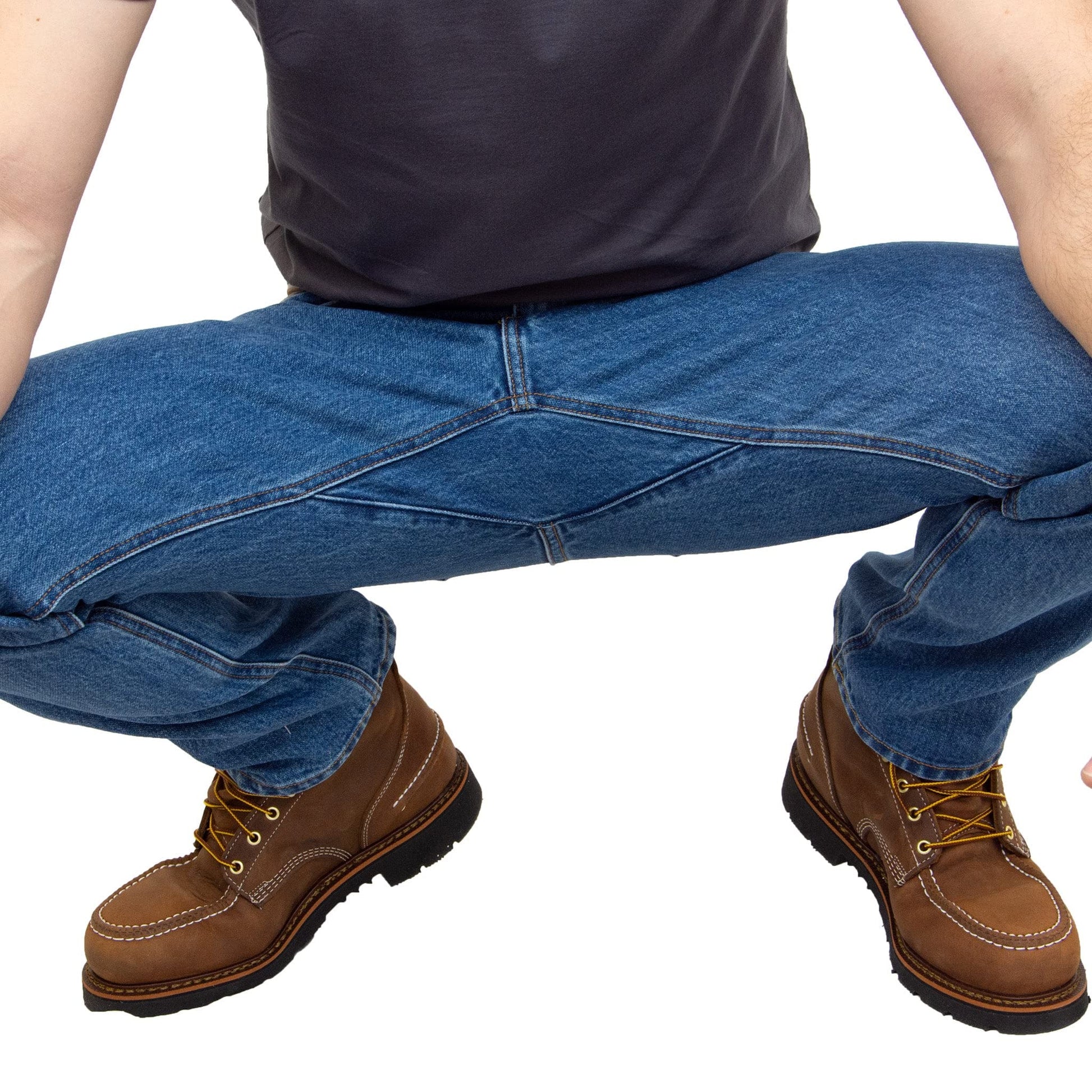This All American Jean is now made with a heavy-weight, premium 15oz denim. It features a comfortable All American, Relaxed Fit - not too tight, not too loose. This jean is a rivet less, zipper fly jean and is constructed with a gusset to improve comfort and durability! This jean is Made in the USA all the way from the materials to the labor. What is a gusset? A gusset is a diamond shaped piece of denim sewn into the crotch of our USA Made jeans. This eliminates 4 seams coming together in one place. We sew this 'gusset' to help disperse stress around the crotch area to create a more comfortable fit and provide freedom of movement. Blue collar workers such as a roofers, plumbers, and farmers typically enjoy the extra space our gusset provides. When having to crouch down and work on your knees, a gusset keeps you out of a pinch.