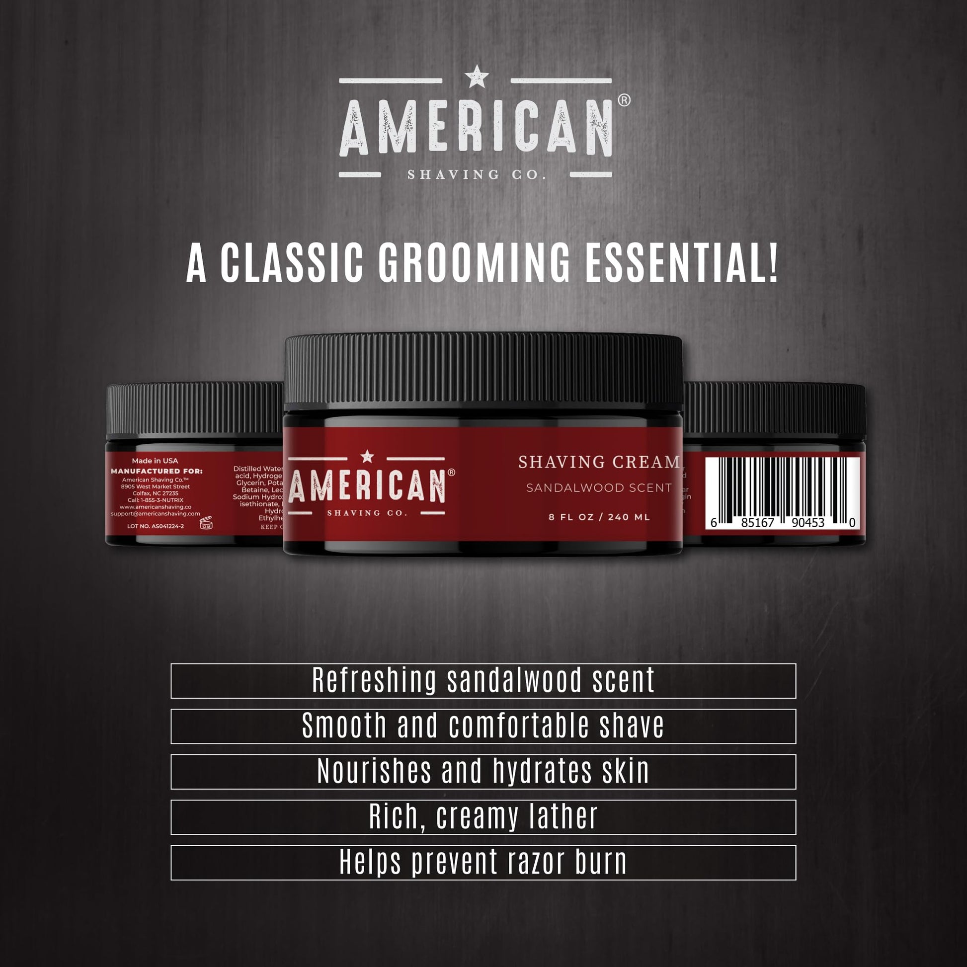 American Shaving Co. Sandalwood Shaving Cream For Men 8 Oz, Made in USA, Easy Application, Quality Potent Ingredients, Long-Lasting, Non-GMO, GMP Certified, Cruelty-Free Products