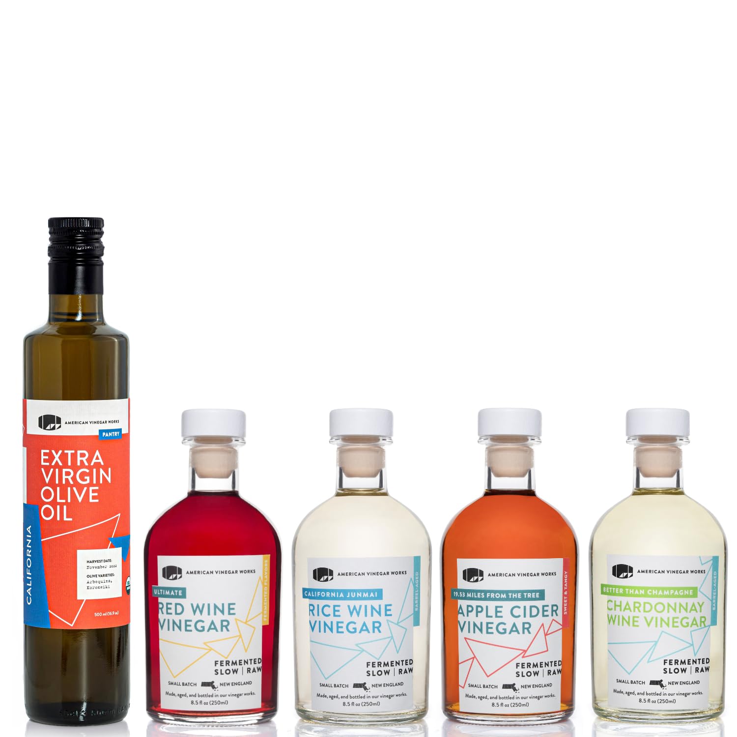 - Includes an 8.5oz bottle of Better Than Champagne Chardonnay Wine Vinegar, Ultimate Red Wine Vinegar, 19 53 Miles From the Tree Apple Cider Vinegar, and California Junmai Rice Wine Vinegar and our 16.9oz bottle of our Organic Extra Virgin Olive Oil