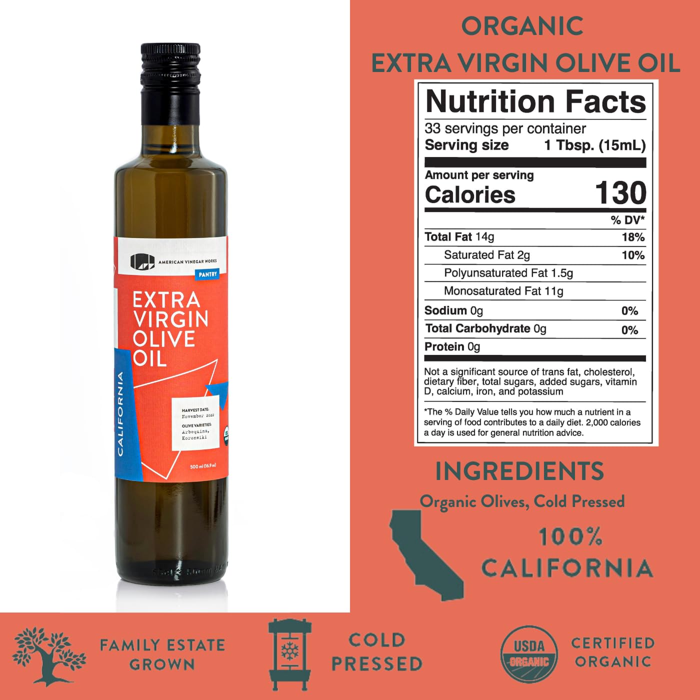 - Our high-quality Organic Olive Oil; Organic olives, cold pressed into a beautiful expression of California’s growing conditions; Our organic extra virgin olive oil achieves balance by bringing together just the right amount of two complementing olive varieties from a single family estate in California; A vibrant finishing olive oil that melds wonderfully with our vinegars and with fresh foods