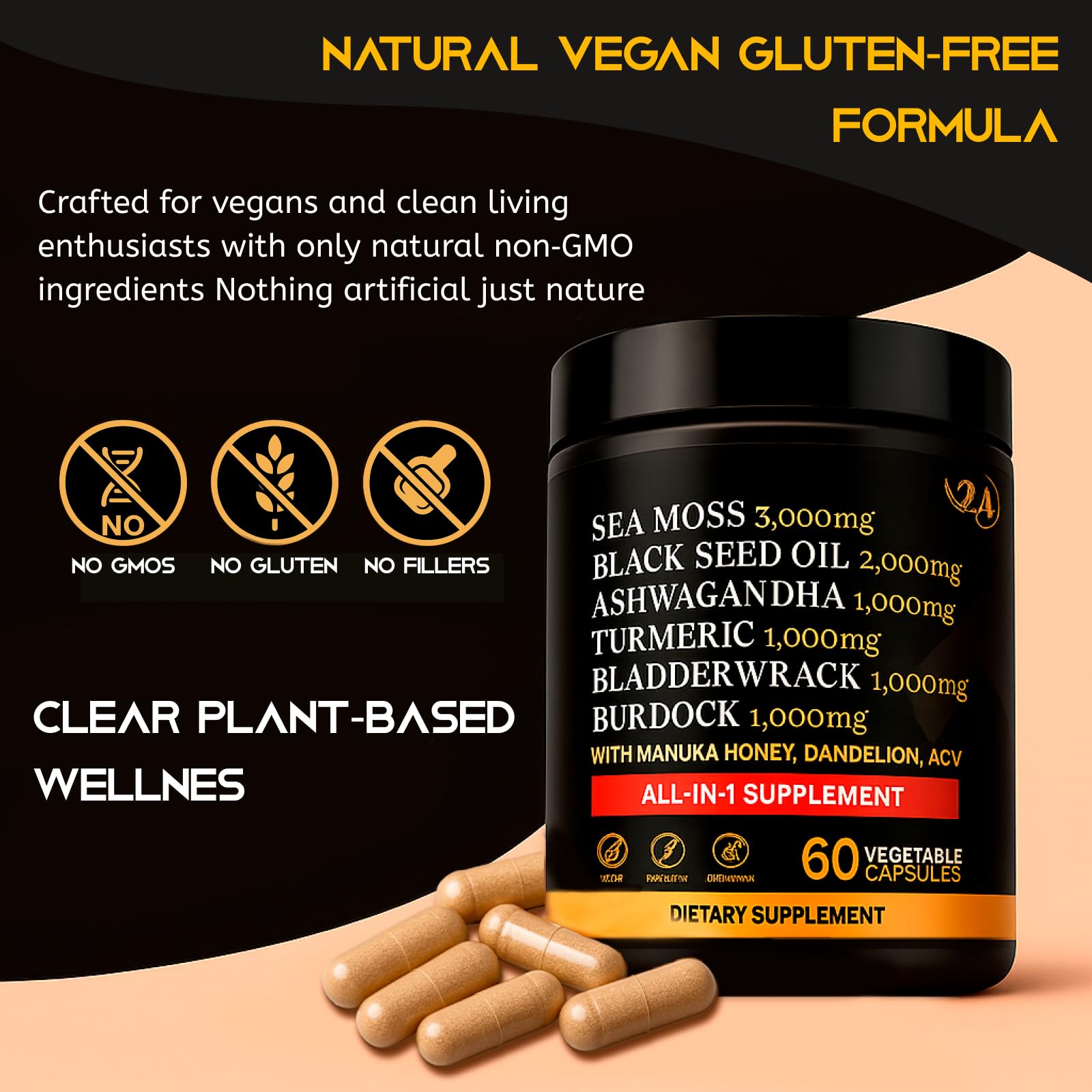 - All-in-One Multimineral Sea Moss Supplement: Burdock root capsules, turmeric with black pepper, sea moss ashwagandha black seed oil, and dandelion root extract are all combined in our potent True Sea Moss complex. This all in one sea moss supplement provides a variety of minerals, vitamins, and nutrients in easy-to-take sea moss pills that promote general health, vitality, and wellness.