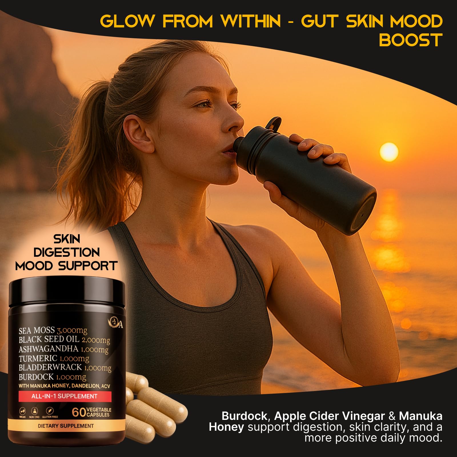 - Age-Defying Wellness, Skin, and Hair: These black seed oil capsules, which are filled with Irish sea moss, manuka honey, and honey extract, support the improvement of cellular life while nourishing skin, hair, and nails. This herbal wellness complex offers vital nutra superfoods for graceful aging, promotes natural bloom and a healthy glow, and helps calm the body.