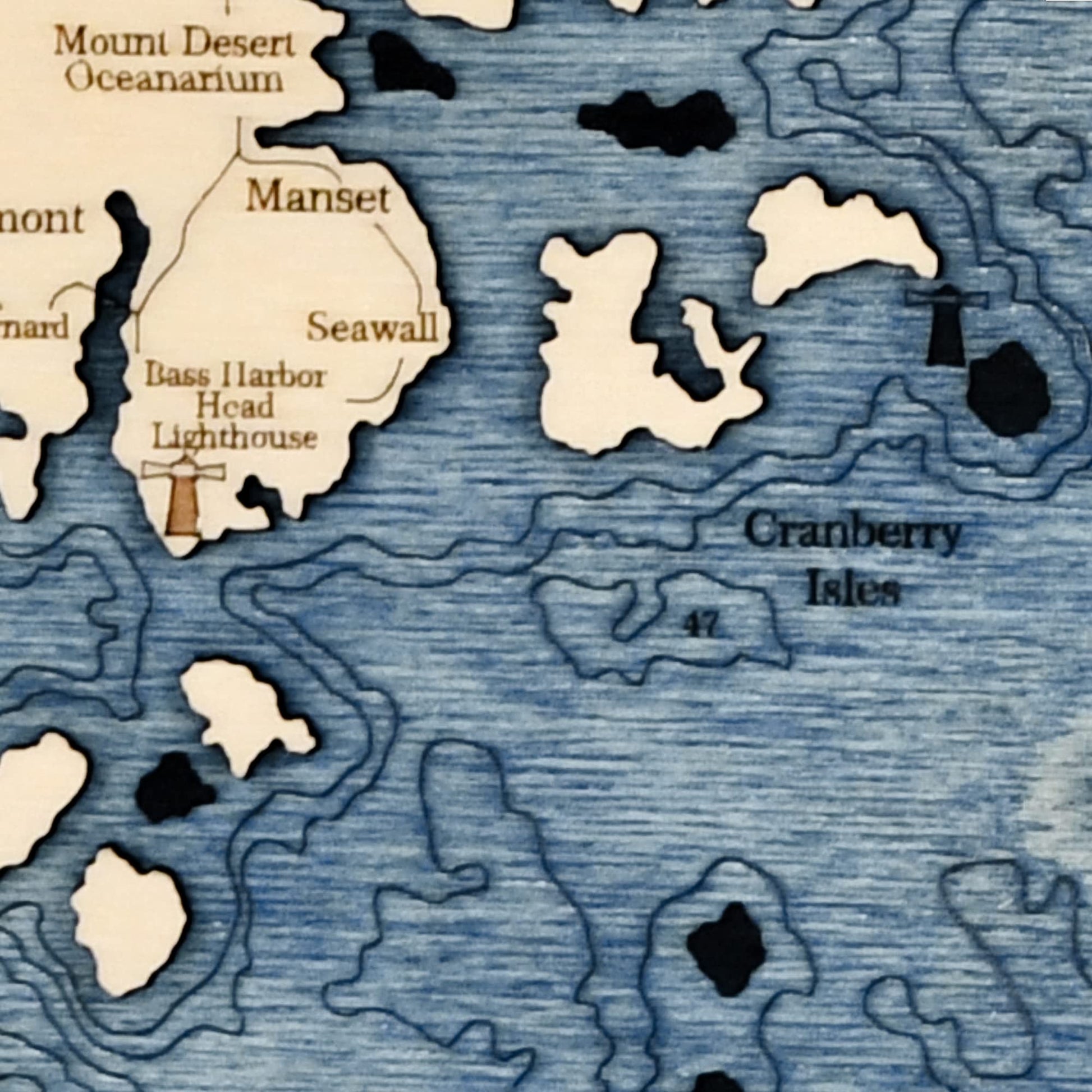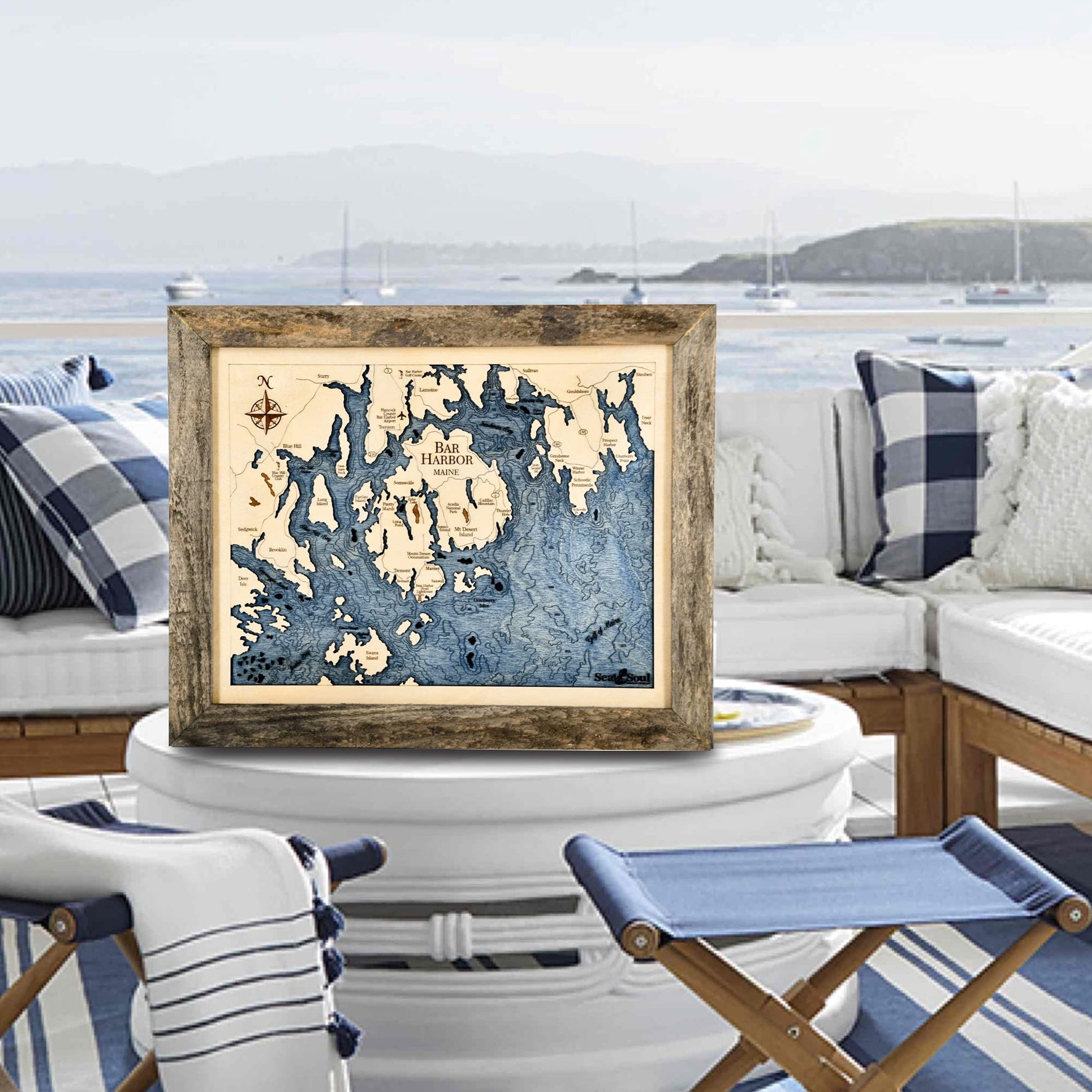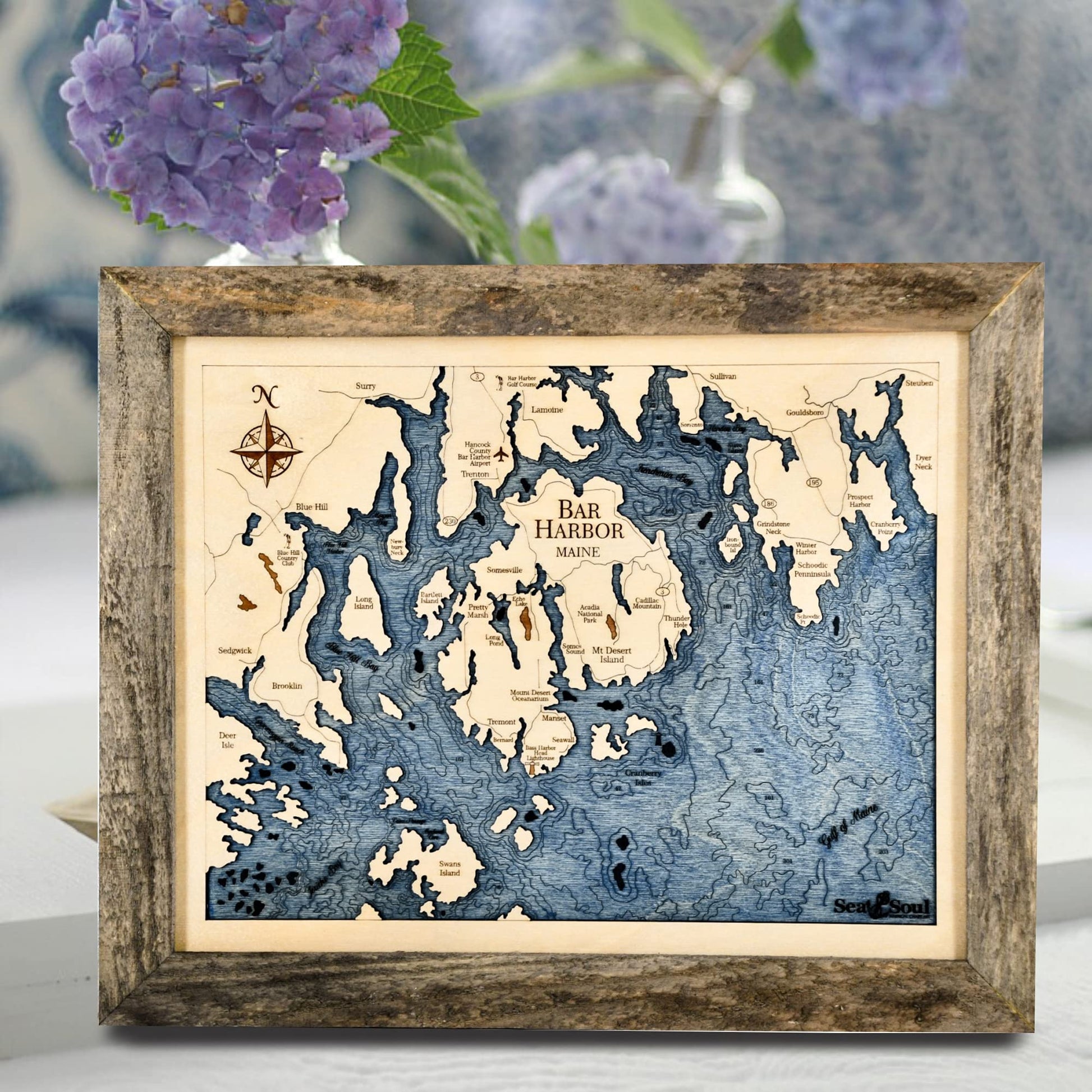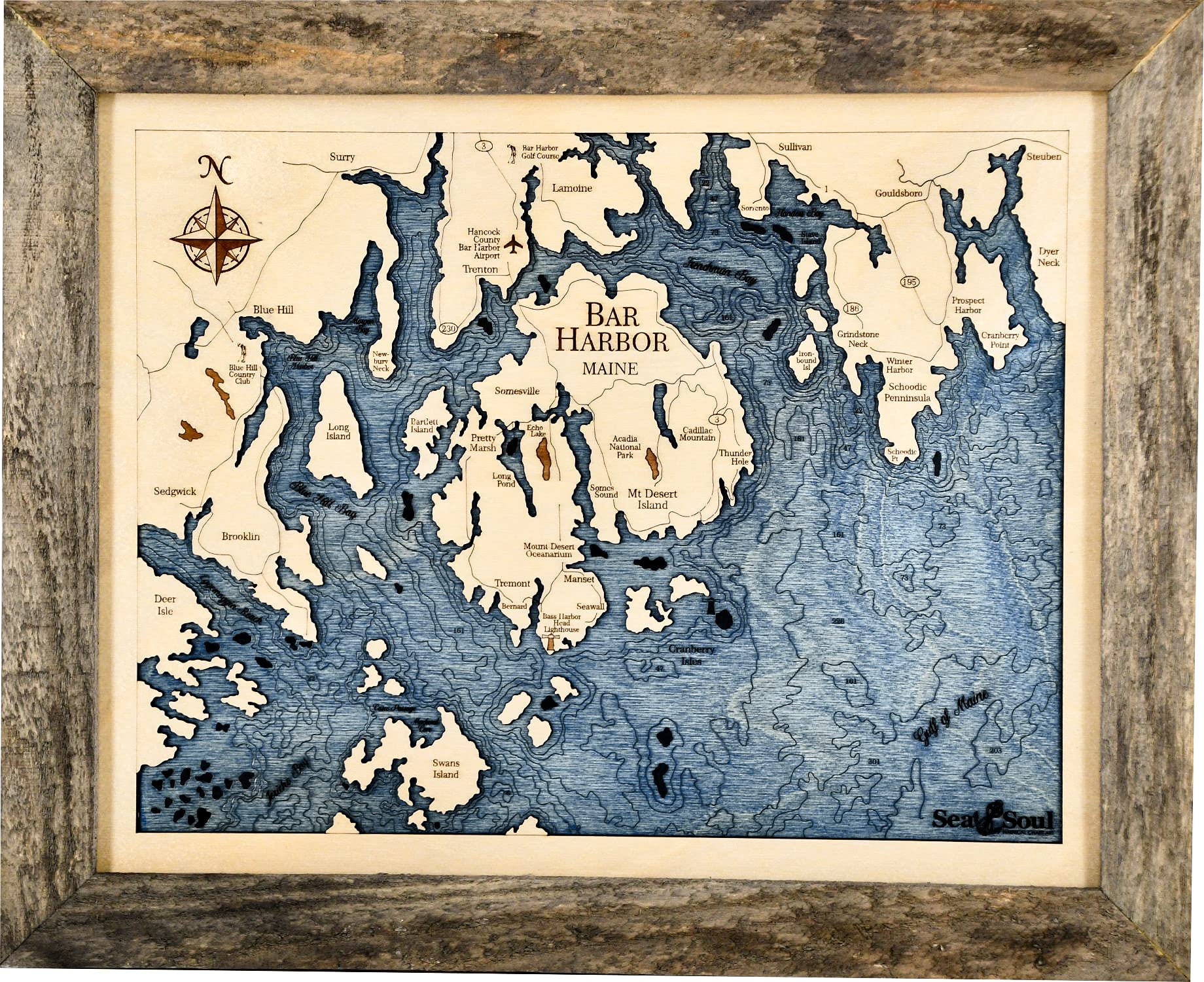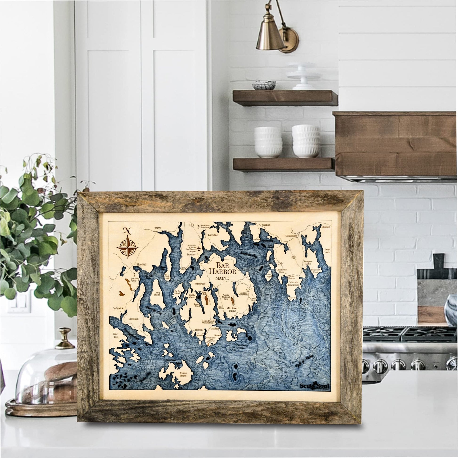 - INTRICATE LASER PRECISION - Topographic nautical maps of Bar Harbor are rendered by our artist using a combination of maps then laser cut and engraved in beautiful detail. Each chart is hand stained and assembled by our craftsmen with the water depicting the bathymetric depth contours, one level below the shoreline.